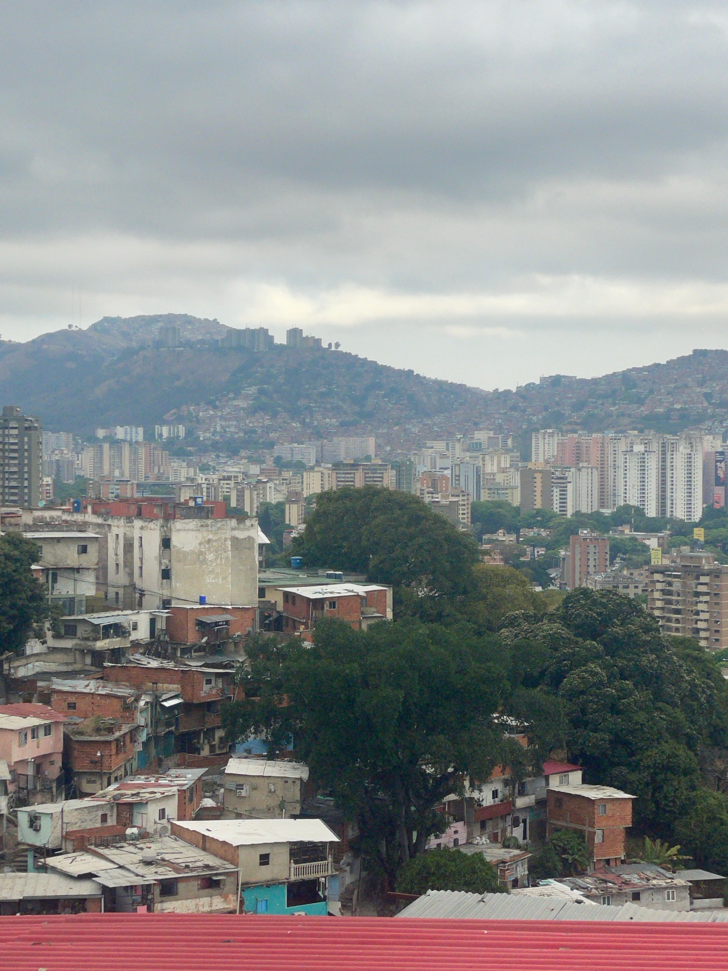 This image presents an elevated, panoramic view of a densely populated urban landscape in Caracas, Venezuela, under an overcast sky. The scene is characterized by a vertical stratification of urban de…read more