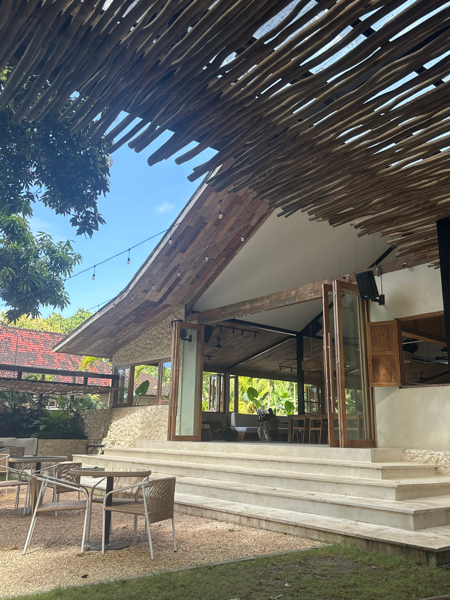 The image depicts an outdoor area, likely a restaurant or resort, in Kuta Selatan, Indonesia. A thatched roof structure dominates the left side of the frame, providing partial shade and framing a view…read more