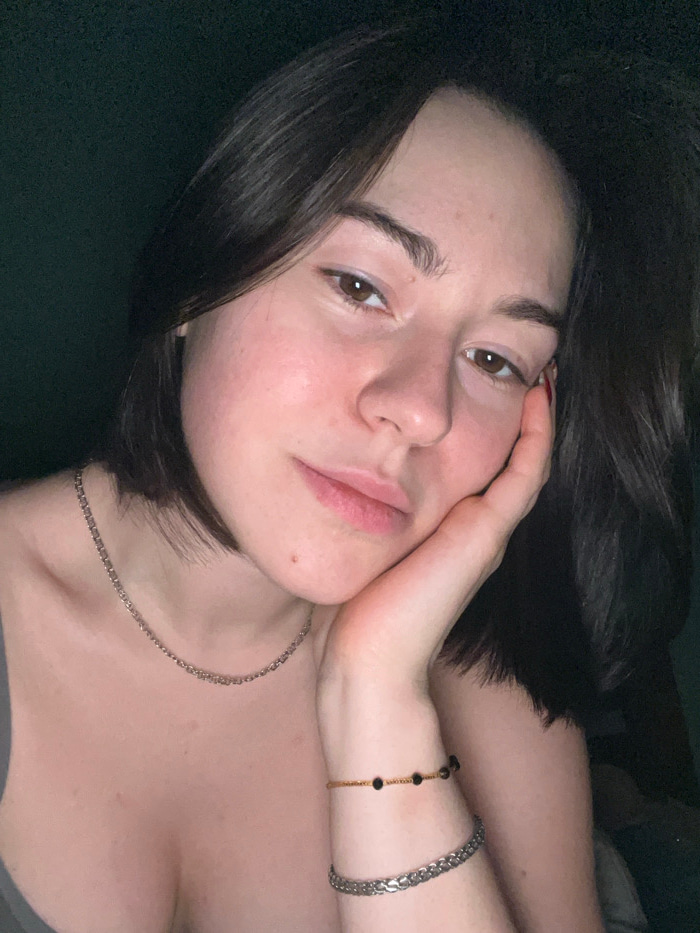 A woman with dark hair and fair skin rests her cheek on her hand. She wears a delicate silver chain necklace and two bracelets on her wrist, one gold with dark beads and one silver link bracelet. The…read more