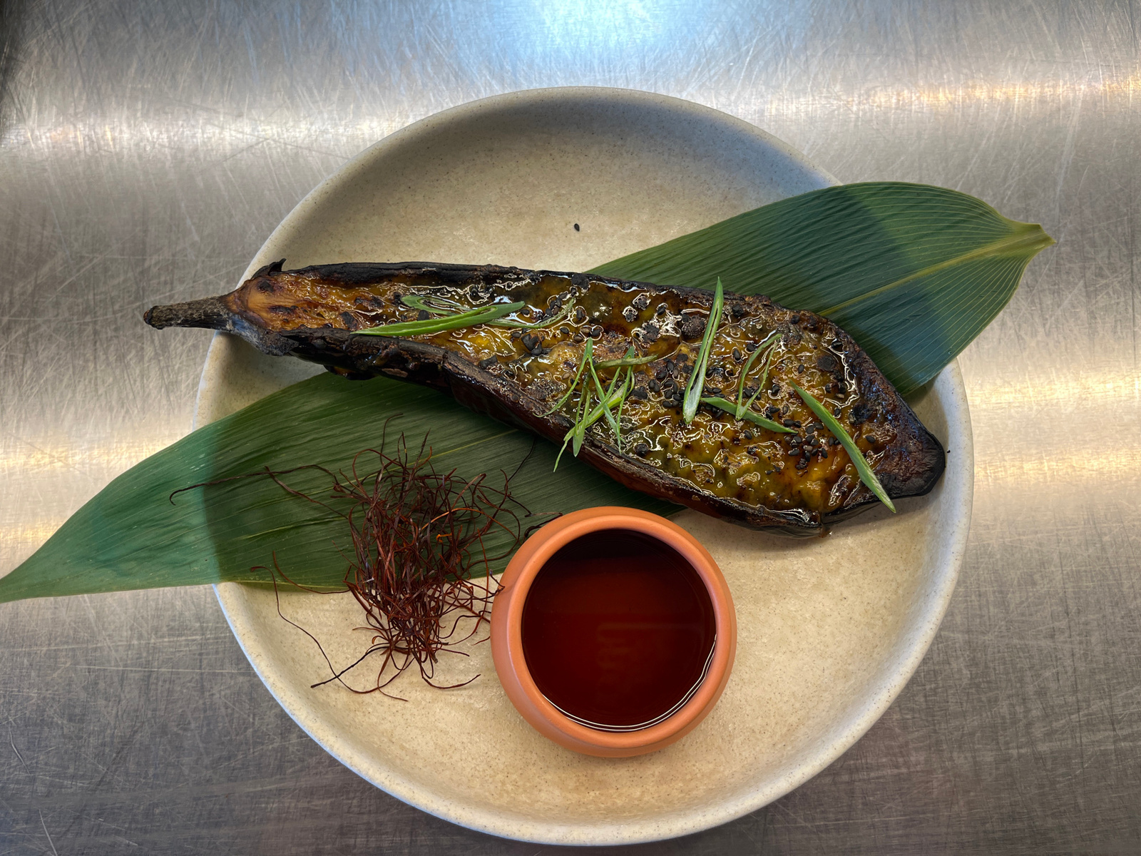 This image presents a gourmet dish meticulously arranged on a rustic plate, set against a backdrop of a scratched, metallic surface, typical of a professional kitchen or restaurant environment in Sofi…read more