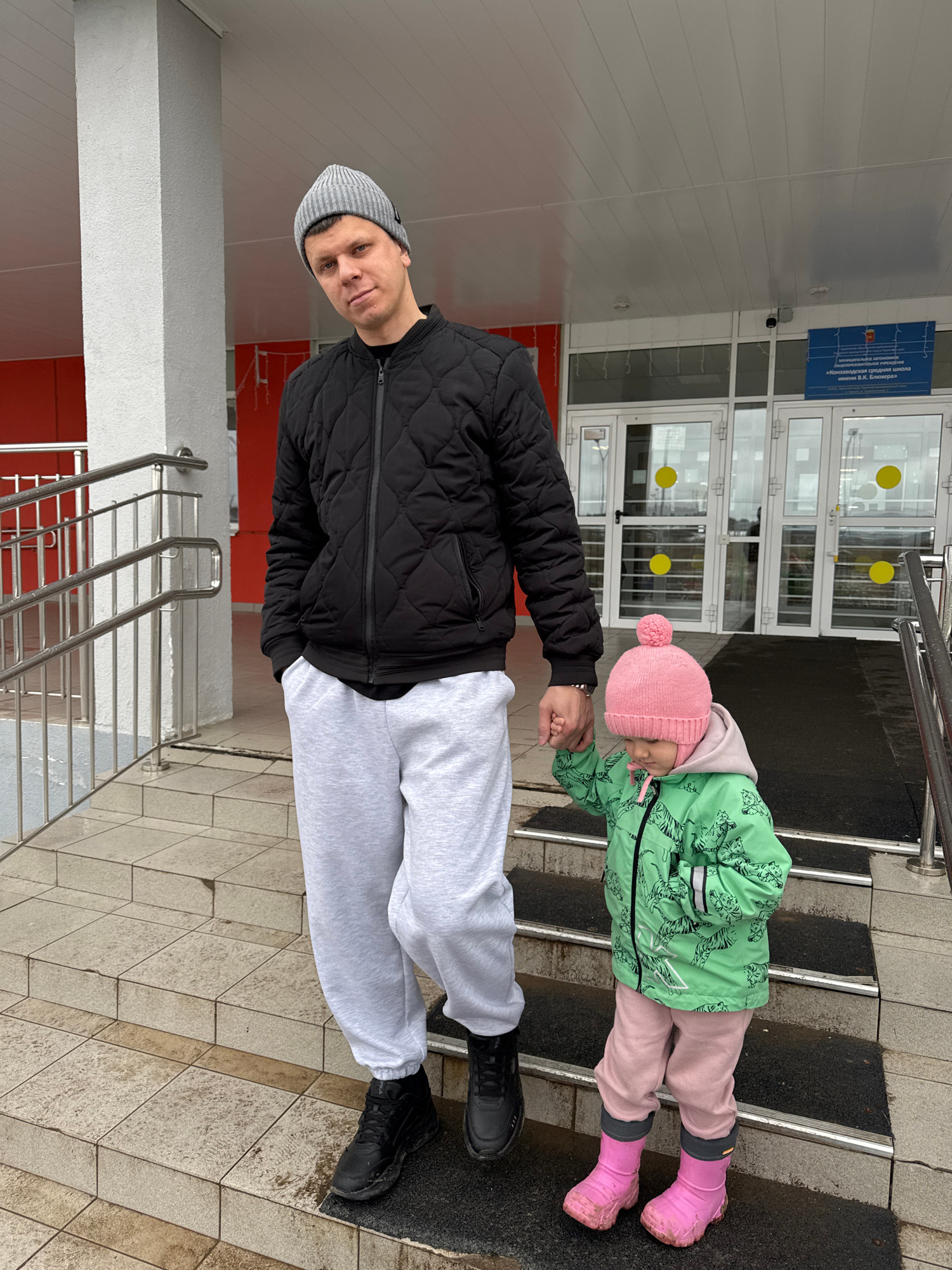 An outdoor scene features a man and a young child holding hands, standing on stone steps in front of a building entrance. The man, positioned on the left, looks towards the camera with a neutral expre…read more