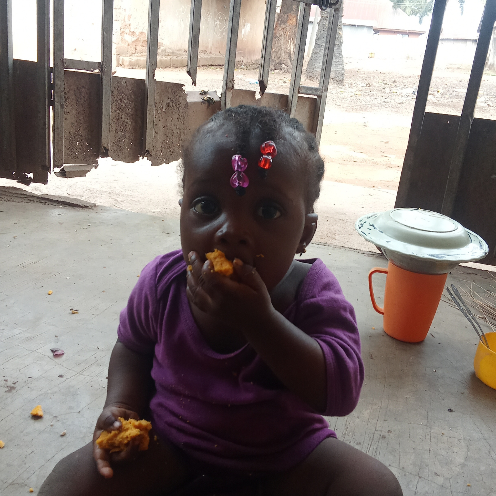 The image depicts a young child, likely between one and two years old, seated on a concrete surface. The child is dark-skinned, wearing a purple shirt, and has decorative beads in their hair. They are…read more