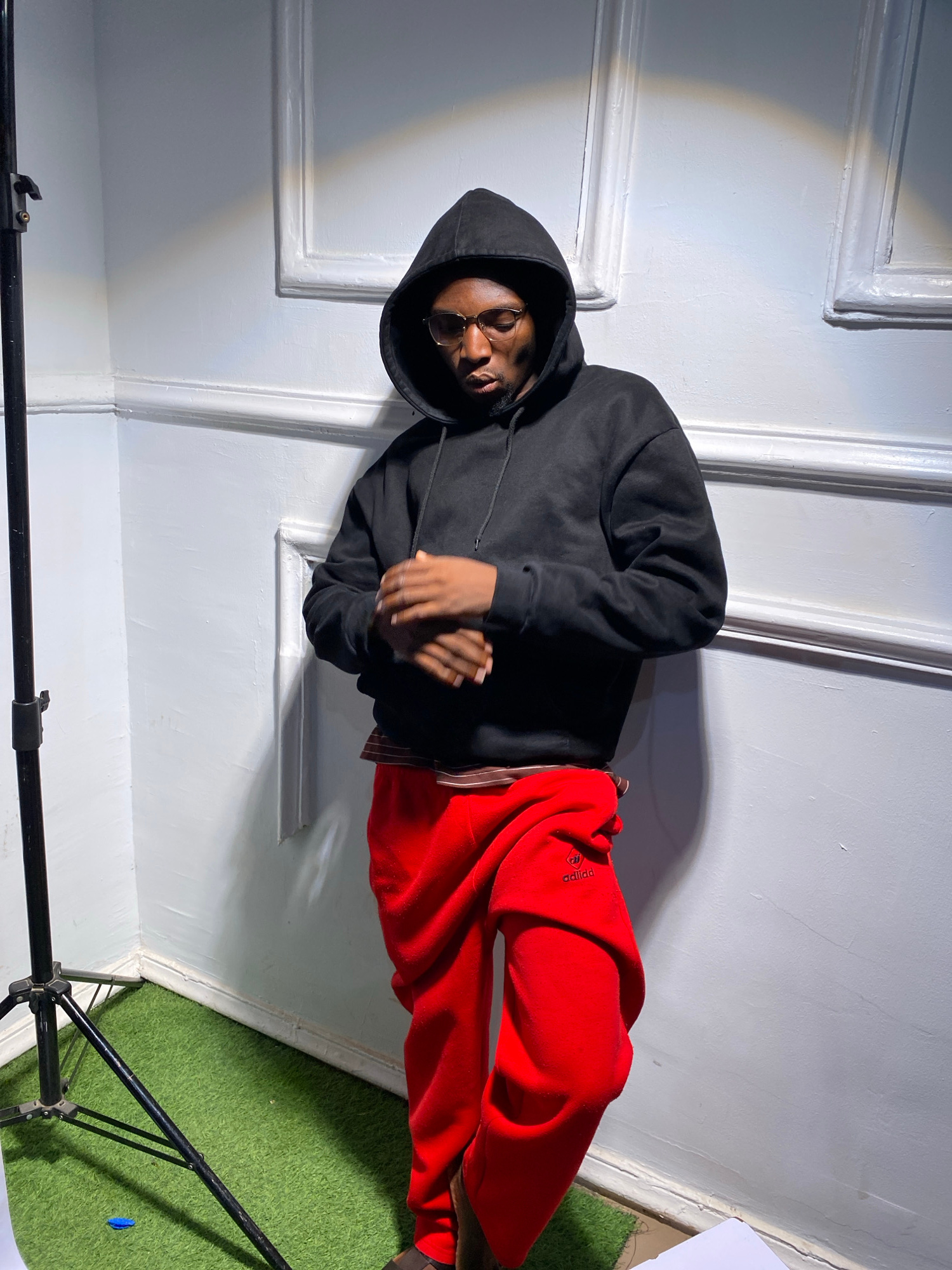 The image shows a young Black man posing for a photograph indoors in Barakin Akawo, Nigeria. He is wearing a black hooded sweatshirt with the hood up and bright red sweatpants. The sweatpants have whi…read more