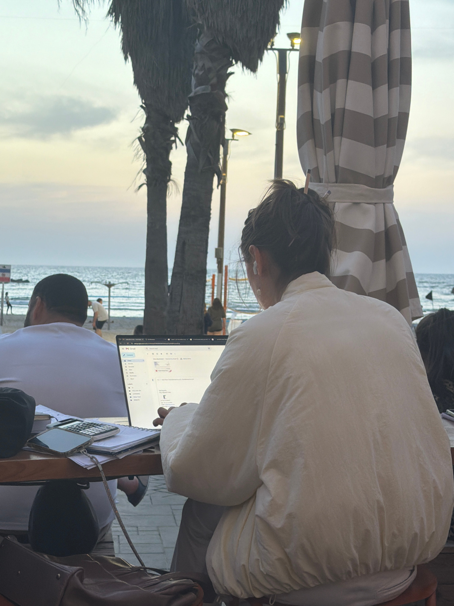The image captures a scene at what appears to be an outdoor cafe or workspace, likely near a beach. The environment suggests a coastal location, possibly Tel Aviv, Israel, given the beach and palm treβ¦read more