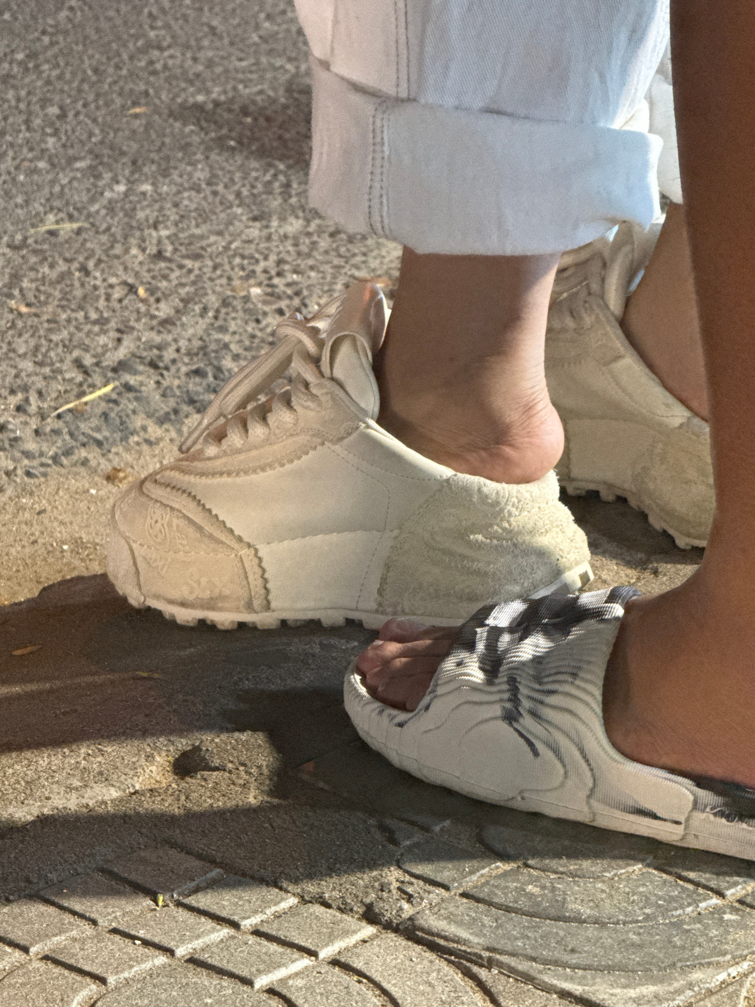This close-up image, taken in Đà Nẵng, Vietnam, captures a person's lower legs and feet. One leg is clad in light-colored, possibly white or off-white, trousers with a neatly cuffed hem. The person i…read more