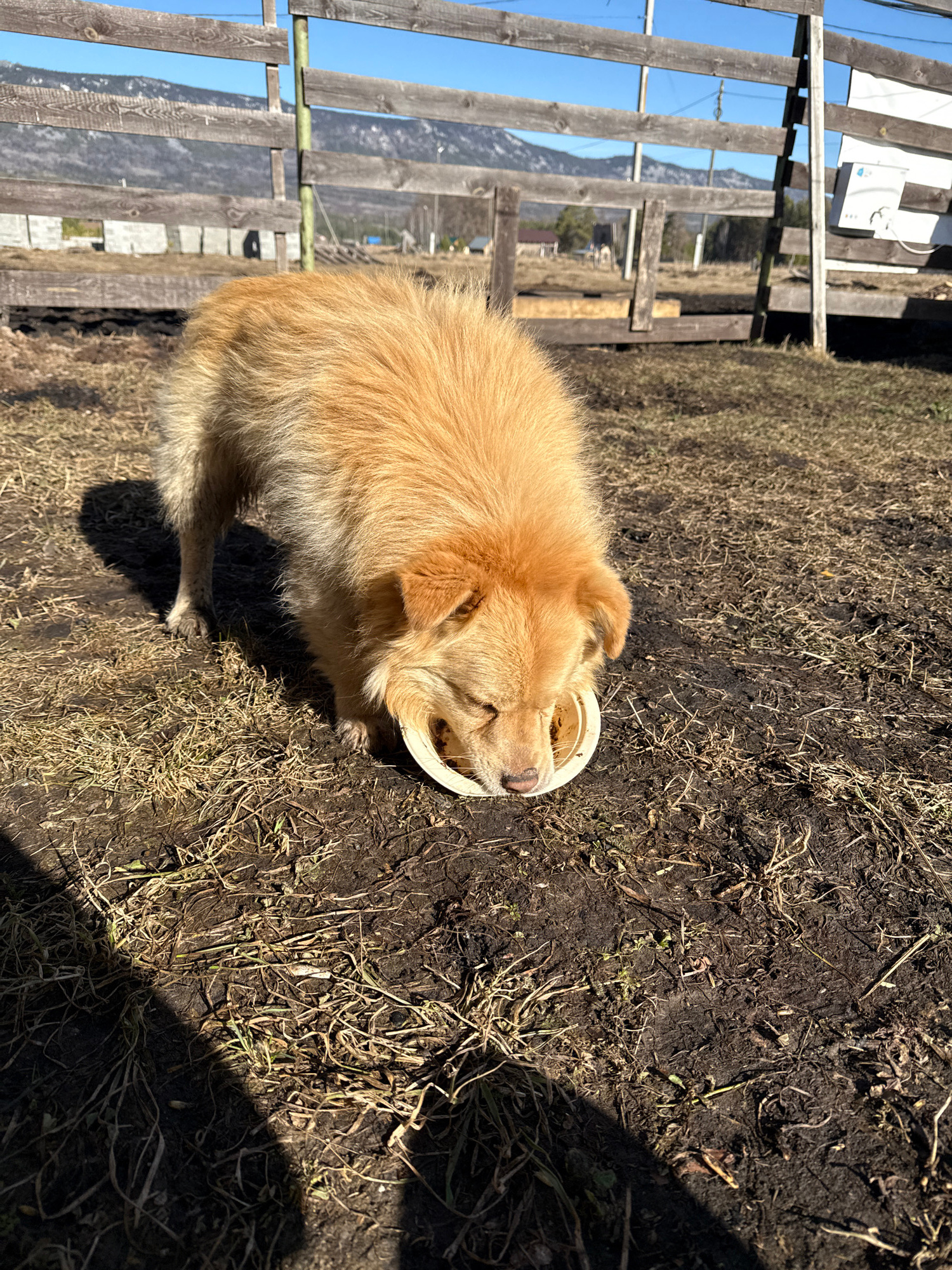 The image depicts a medium-sized, golden-colored dog eating from a light-colored bowl on bare ground interspersed with dry grass and mud. The scene is outdoors, with a wooden fence visible in the back…read more