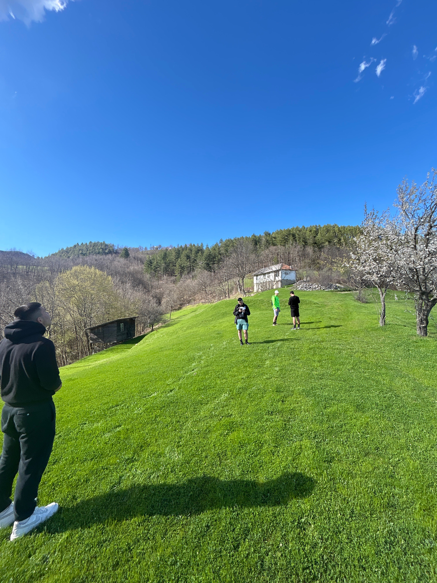 The image shows a grassy field in Alamovtsi, Bulgaria, with three people lying on the grass. In the background, there are trees, a building, and a blue sky with some clouds. The shadow of the person t…read more