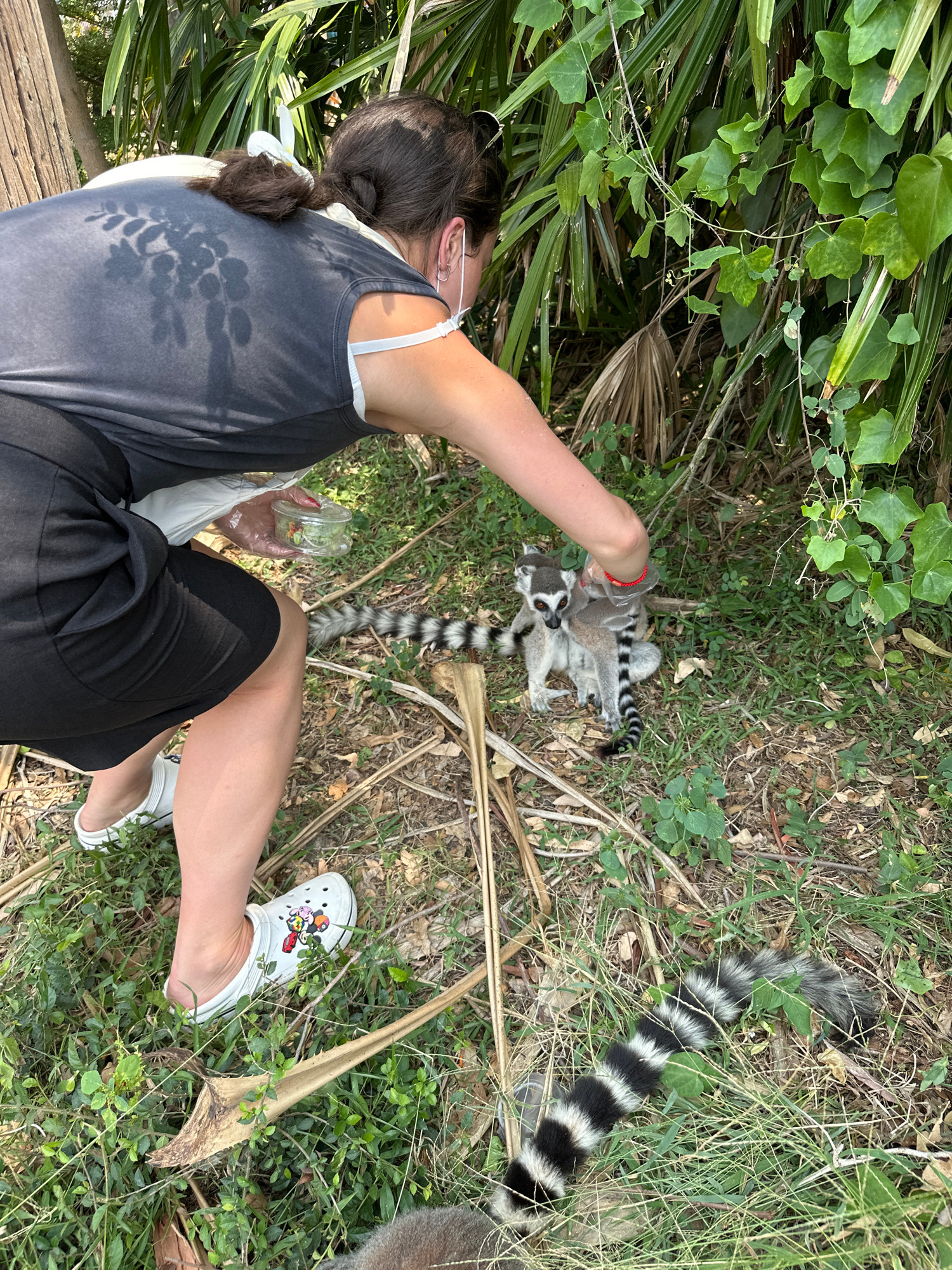 A person is kneeling on grass and feeding lemurs in an outdoor setting, likely a zoo or wildlife park. The person, likely a female, wears a grey tank top, black shorts, and white Crocs with cartoon de…read more