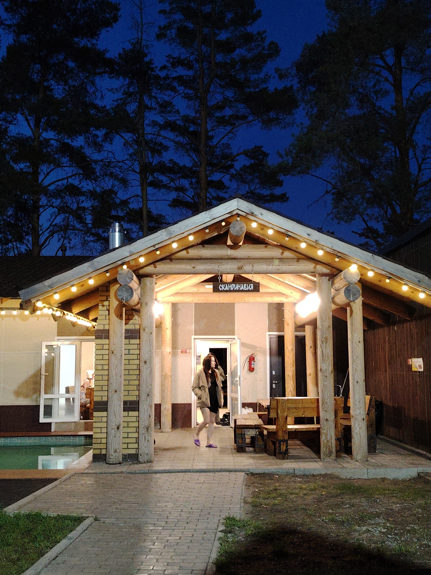 Captured at night in Chaikovsky, Russia, the image presents a single female figure exiting a building marked with the Cyrillic word "Скандинавия." The building features a covered porch illuminated by…read more