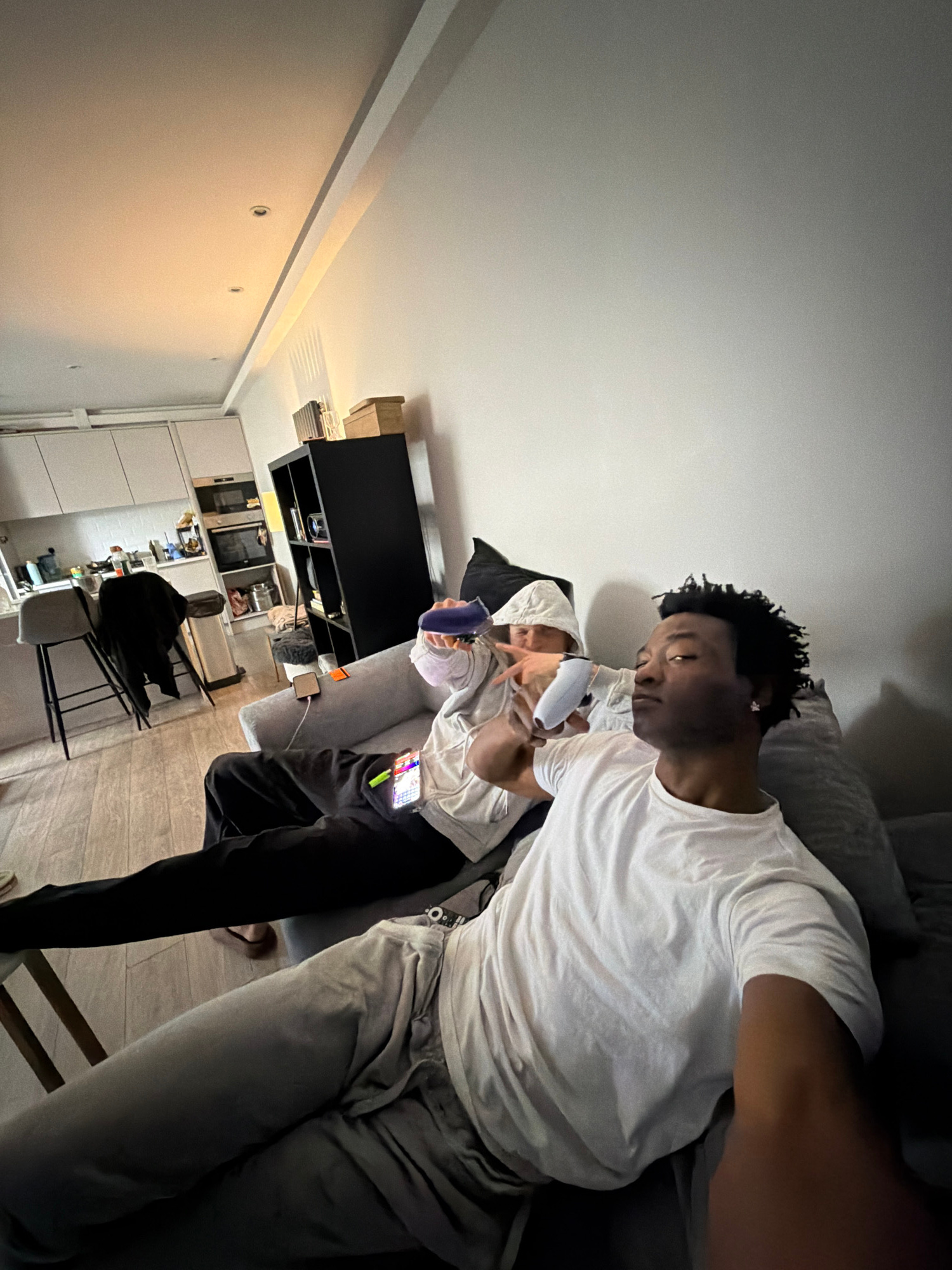 Two individuals are visible in an interior setting, possibly a residential apartment. One individual, a Black male, is closer to the camera, wearing a white t-shirt and grey trousers, lying on a grey…read more