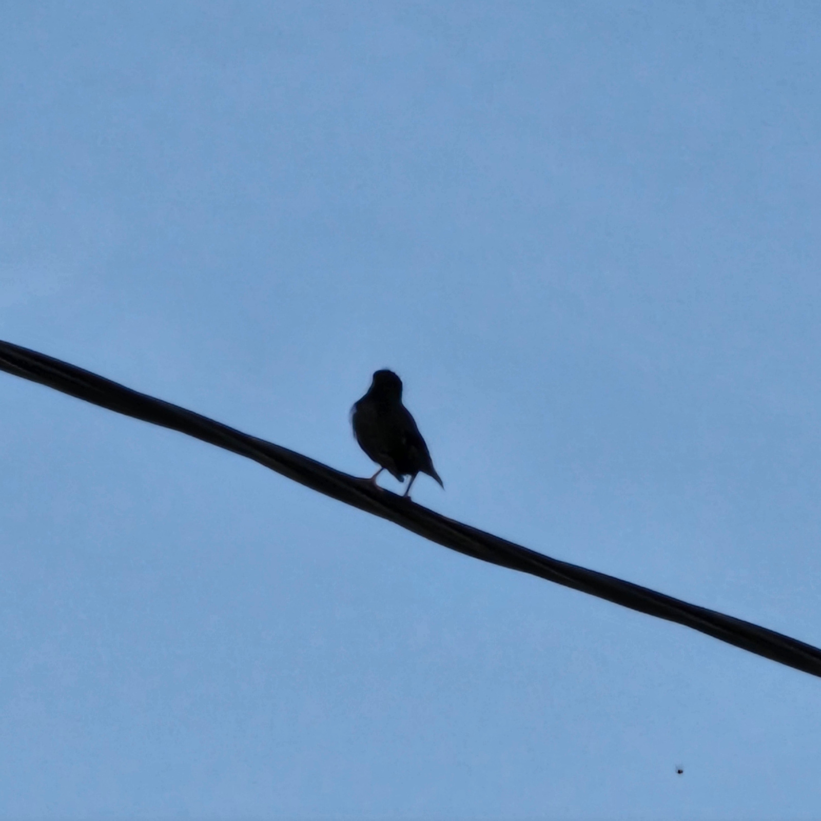 A bird perches on a thick black wire against a light blue sky. The wire appears to be a power line. A small dark speck is visible in the upper right corner. The location is indeterminate without furthβ¦read more