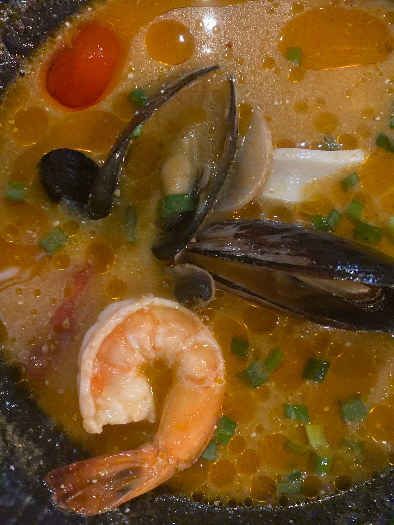 A close-up shot depicts a bowl of seafood soup. The soup contains mussels, shrimp, squid, and a tomato. Green onions are sprinkled on top. The soup is in a dark bowl, and there are oil droplets on the…read more