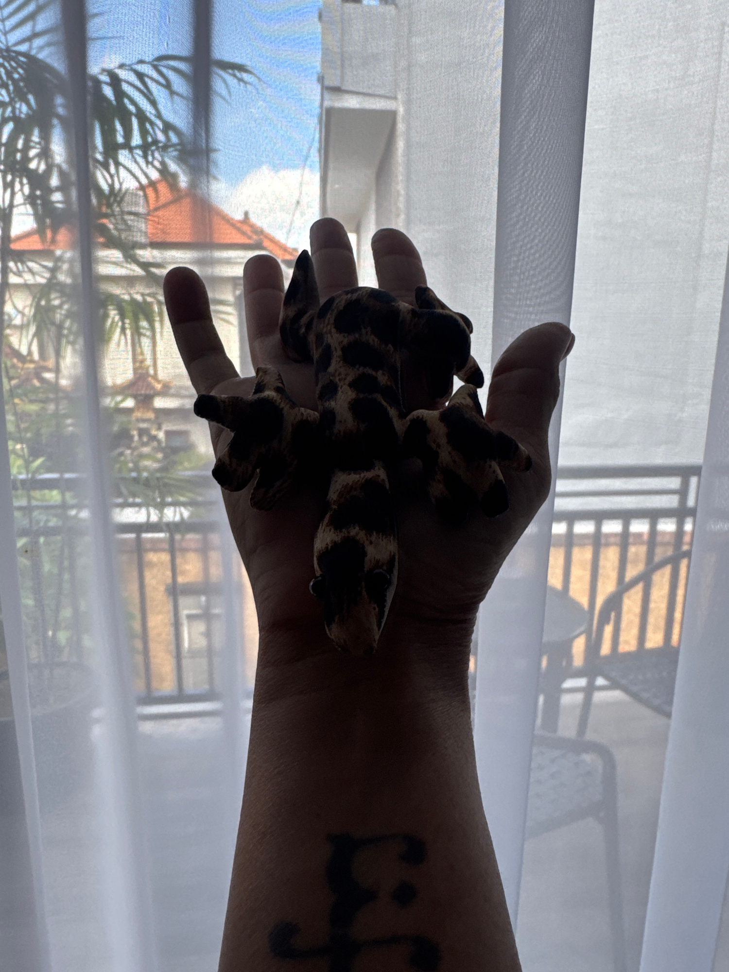 A medium shot depicts a hand holding a spotted animal figurine against a backdrop of a sheer white curtain. The hand and figurine are silhouetted, emphasizing the shape and texture of both. The foregr…read more