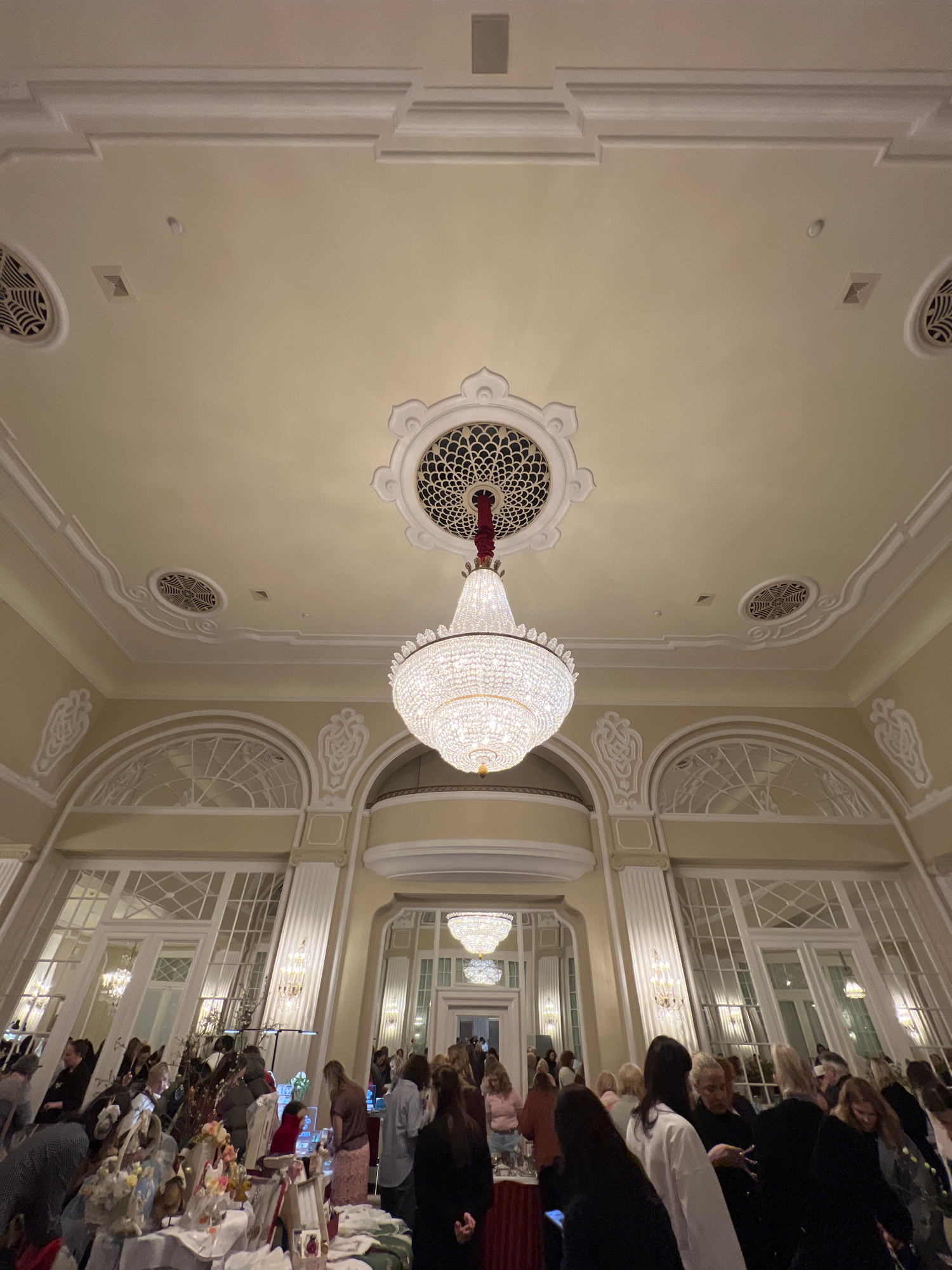 The image captures an ornate interior, likely a ballroom or grand hall, with a large, multi-tiered crystal chandelier as the central focal point. The ceiling is decorated with intricate plasterwork an…read more