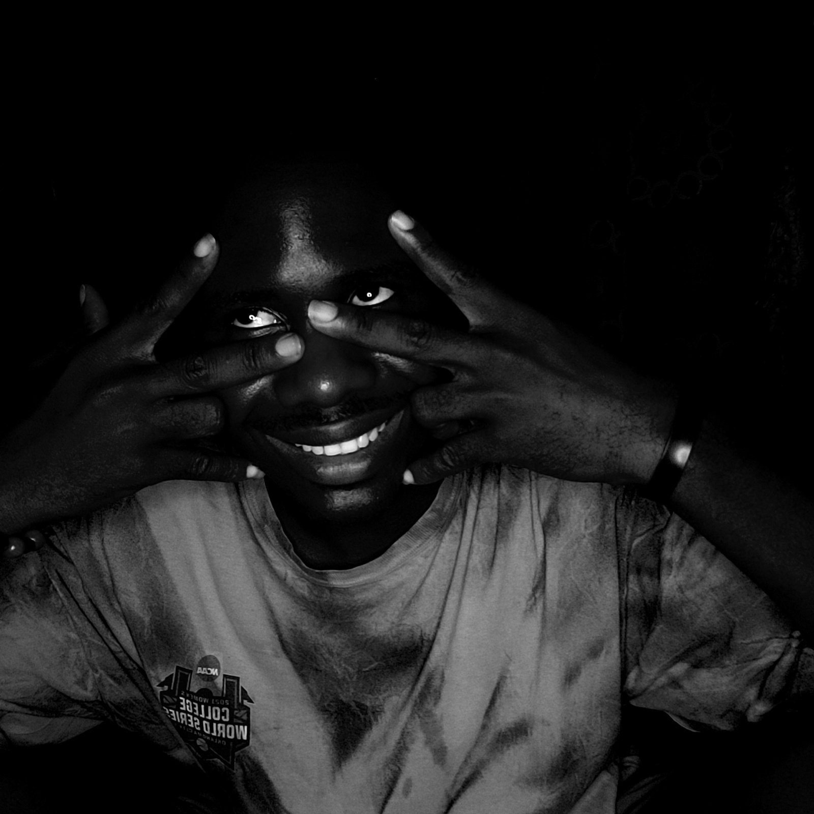 A high-contrast, black and white portrait captures a person from Narayi, Nigeria, in an expressive and playful pose. The subject has dark skin and appears to be looking upwards at the camera, possibly…read more