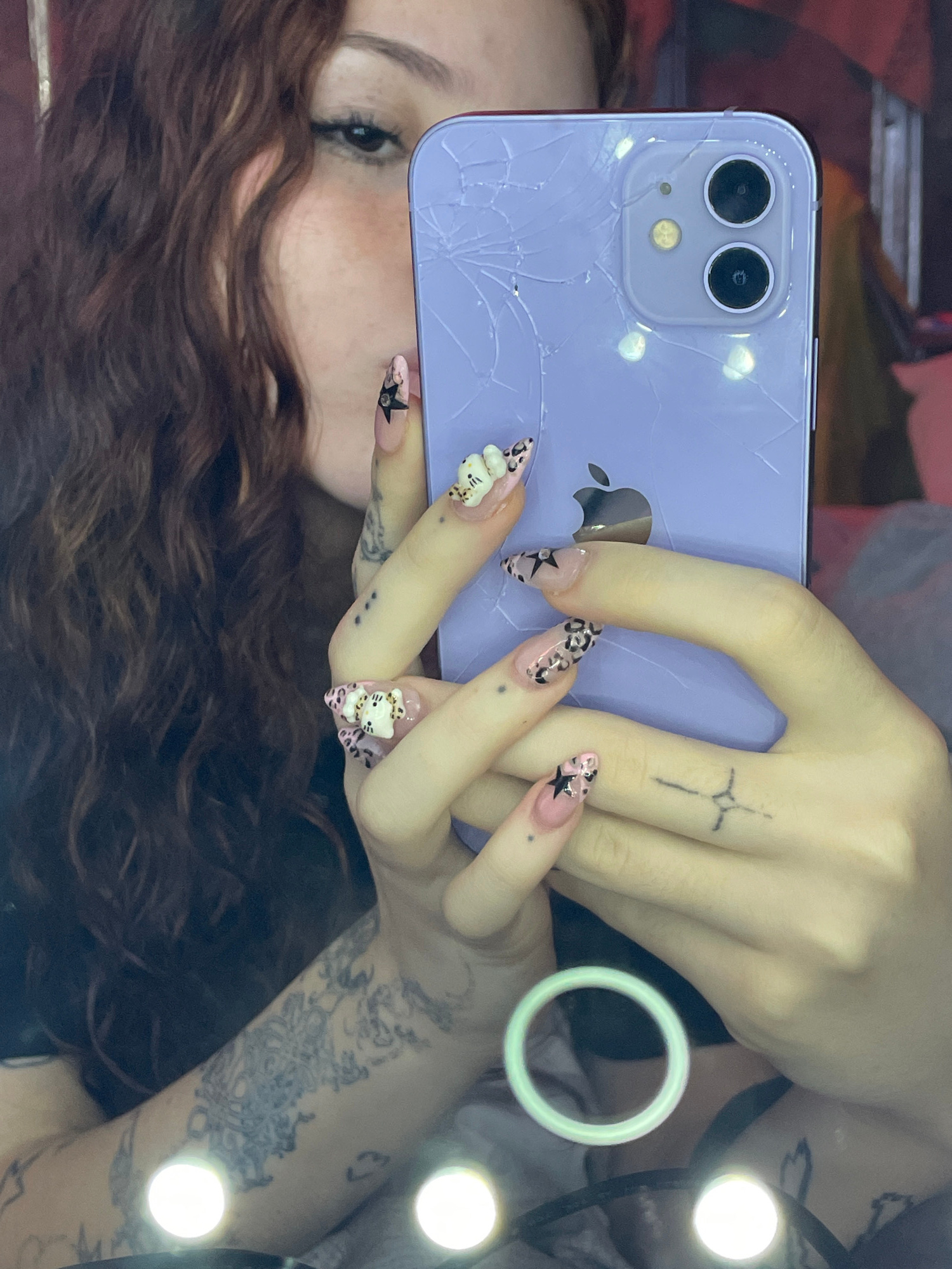 A mirror selfie captures a person holding a purple iPhone with a severely cracked back, particularly around the dual camera lenses and the lower section. The individual's hands are prominently feature…read more