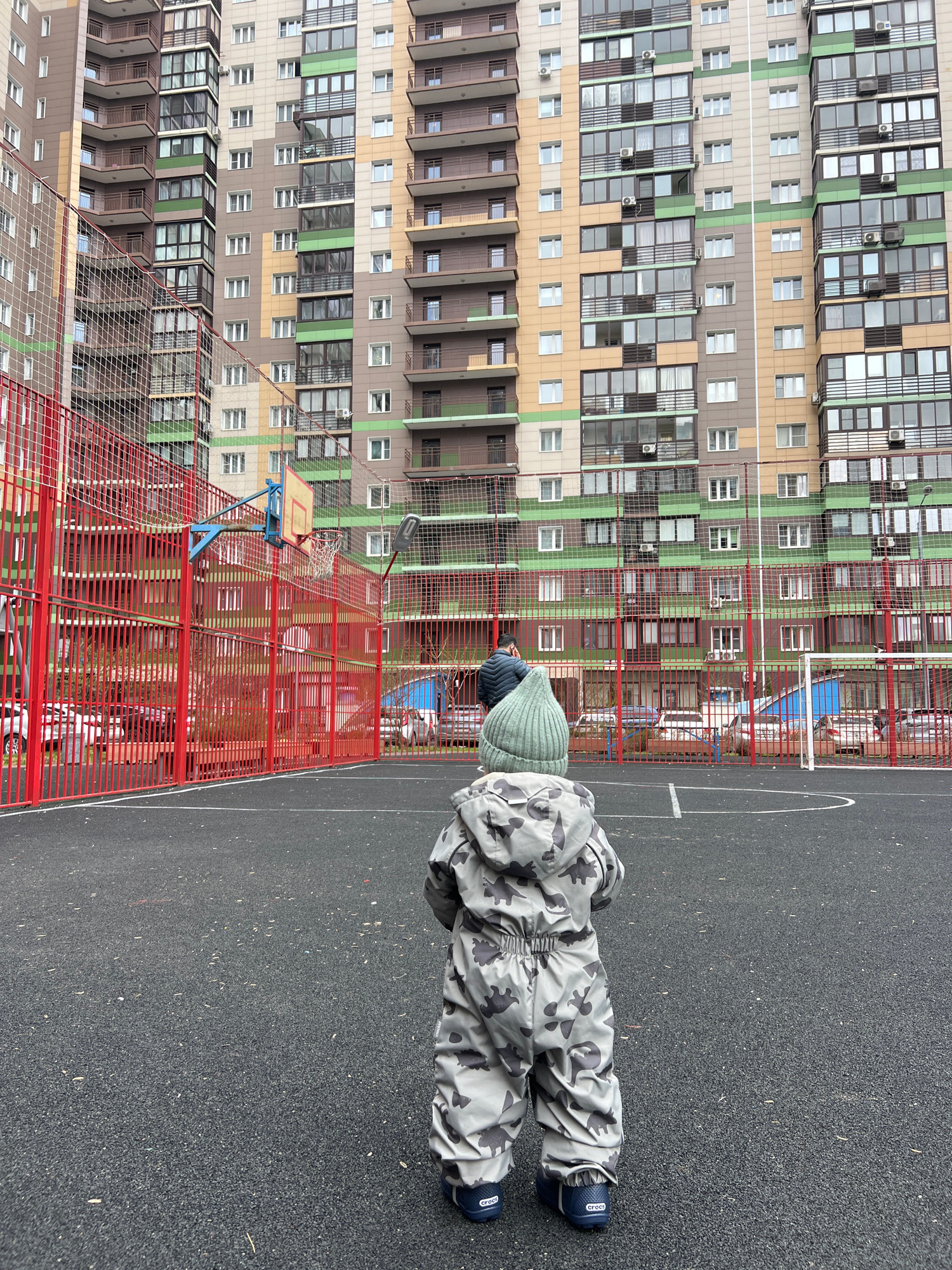 The image, rotated 90 degrees counter-clockwise, captures an outdoor scene featuring a person on a sports court with a large residential building in the background. The central subject is a person, li…read more