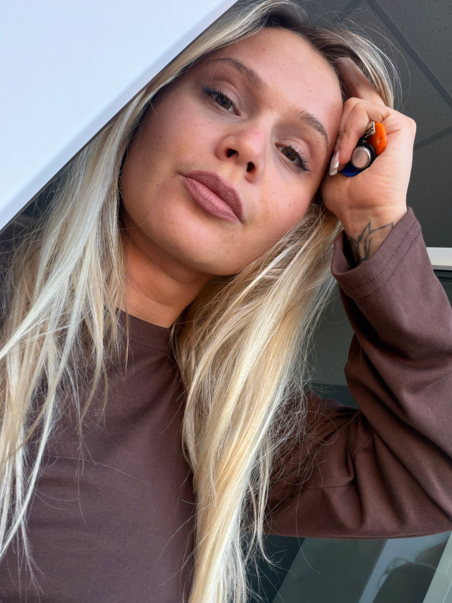 A woman with long, blonde hair is positioned close to the camera, her head tilted. She is wearing a brown long-sleeved shirt. Her hand, adorned with a tattoo, rests on her forehead. The scene includes…read more