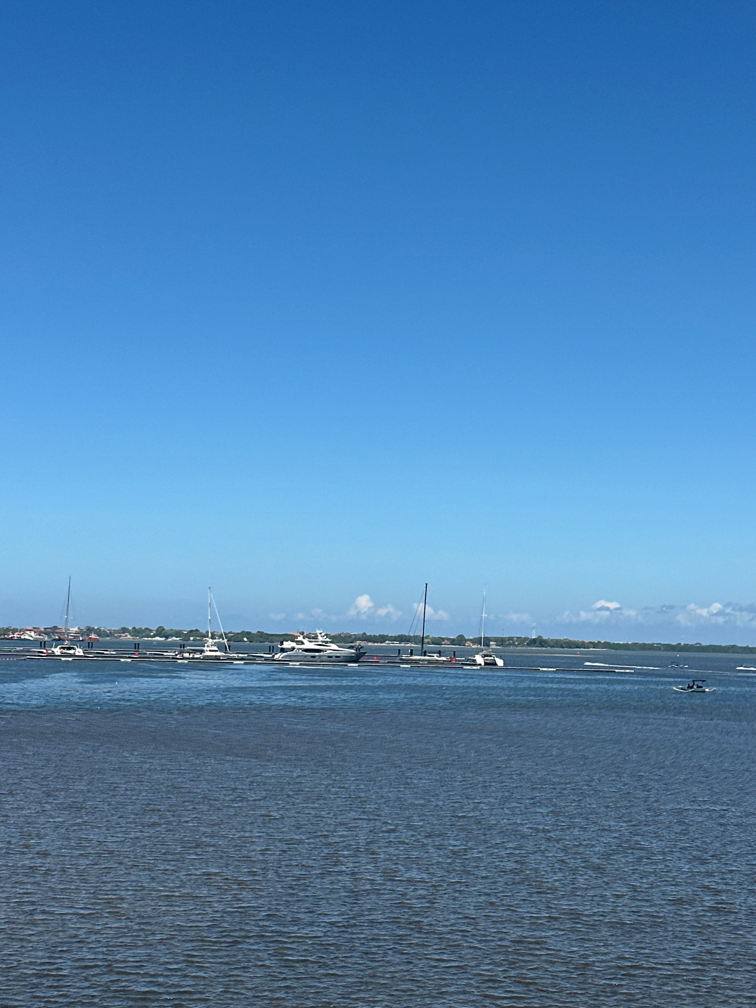 The image shows a waterfront scene, likely a marina or harbor, with a body of water on the right and a clear blue sky on the left. Several boats are docked along a pier or shoreline. The water appears…read more