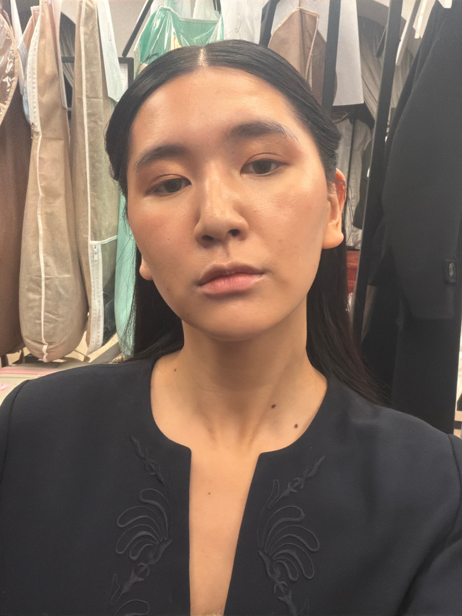 A close-up, portrait-style photograph features a young East Asian woman, depicted from the waist up. She has dark, straight hair, neatly parted in the middle and pulled back, and a clear complexion wi…read more