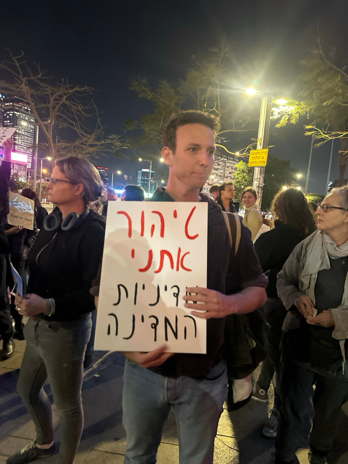 The image captures a nighttime scene of a public gathering or protest, oriented vertically with people appearing to stand sideways in the frame. In the immediate foreground, a man with short, dark hai…read more