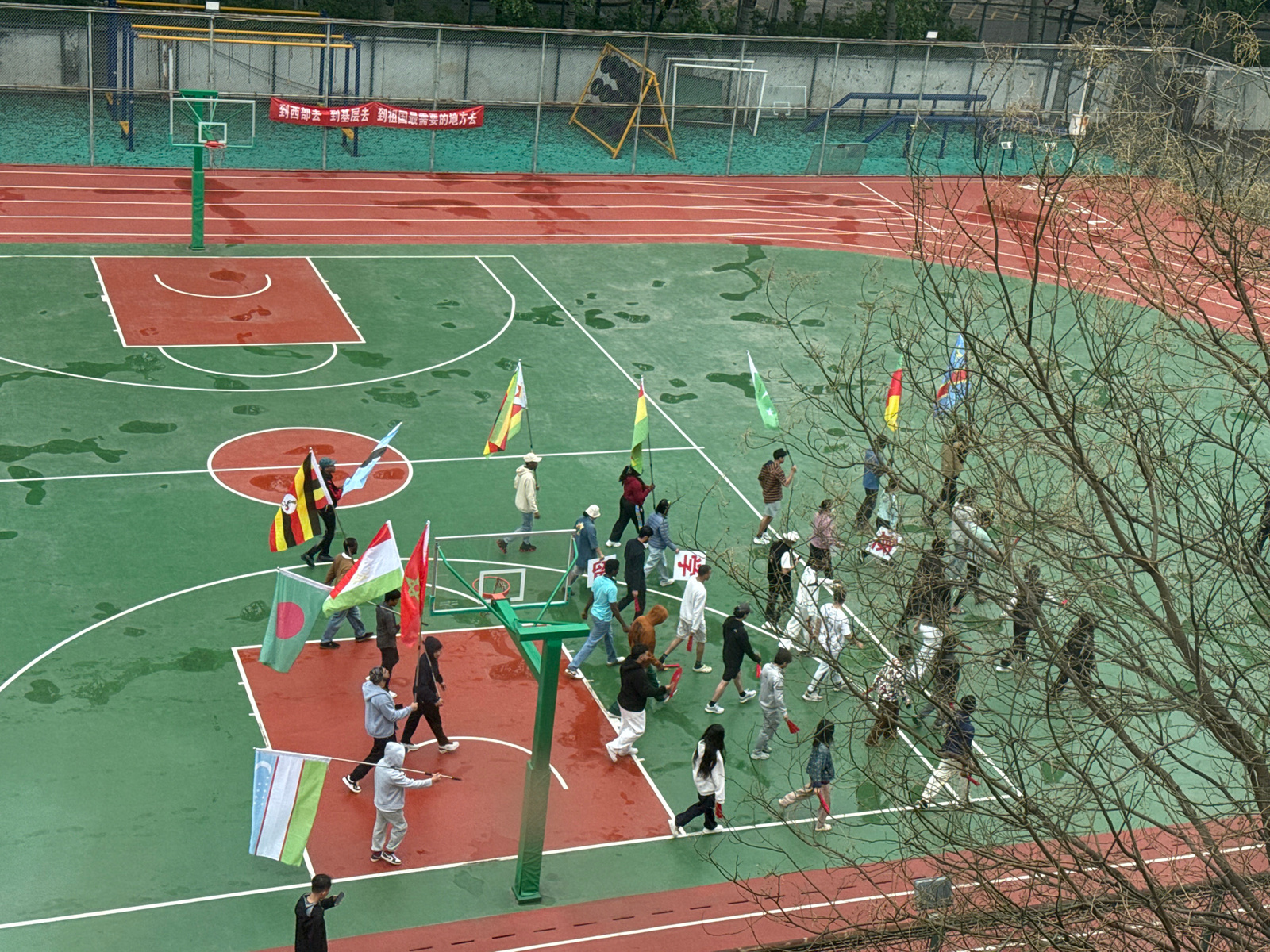 The image captures an overhead view of an outdoor sports ground, likely a university or school campus in Daxing District, China, featuring a basketball court and a running track. The surfaces are wet…read more