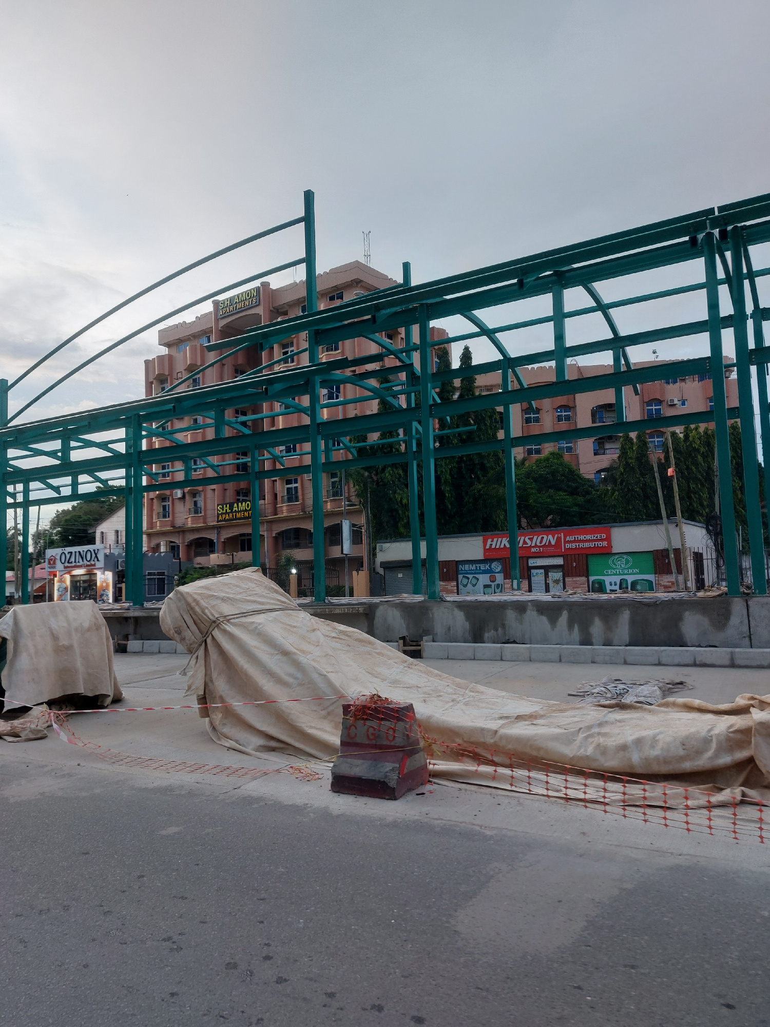 This is an outdoor shot of an urban setting, specifically a street scene in Dar es Salaam, Tanzania. The image has an industrial or construction-site feel. In the foreground, there is a teal-colored…read more