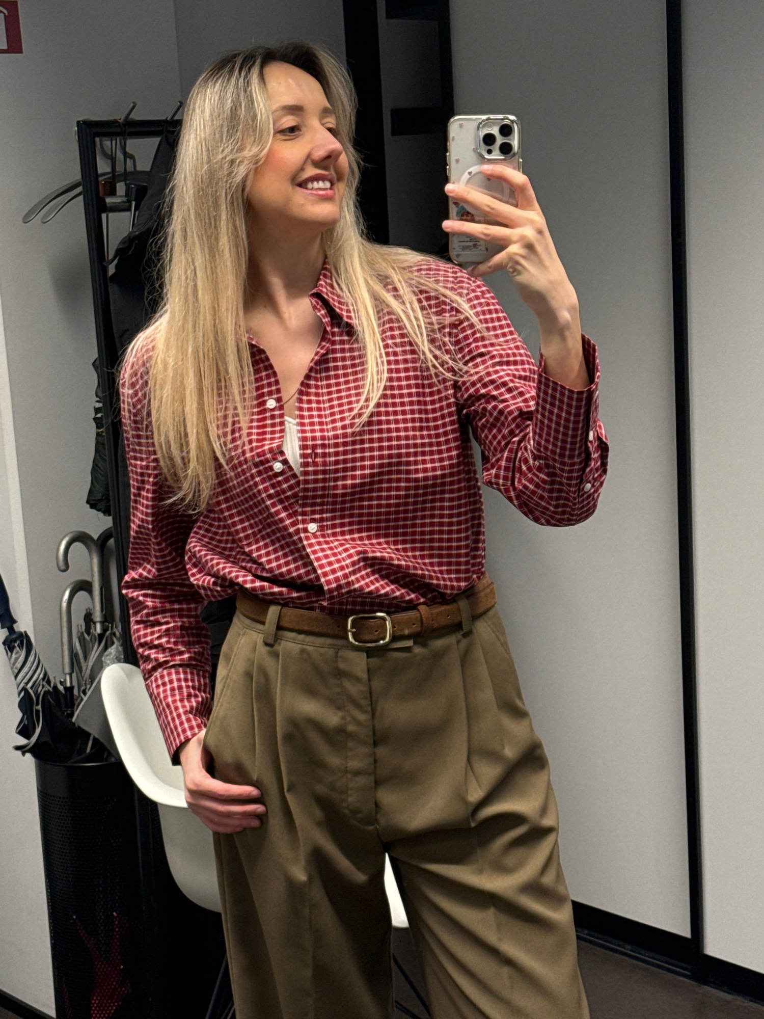A woman is captured in a mirror selfie inside what appears to be a commercial or institutional building in Riga, Latvia. She is smiling broadly, revealing her teeth, and has long, straight blonde hair…read more