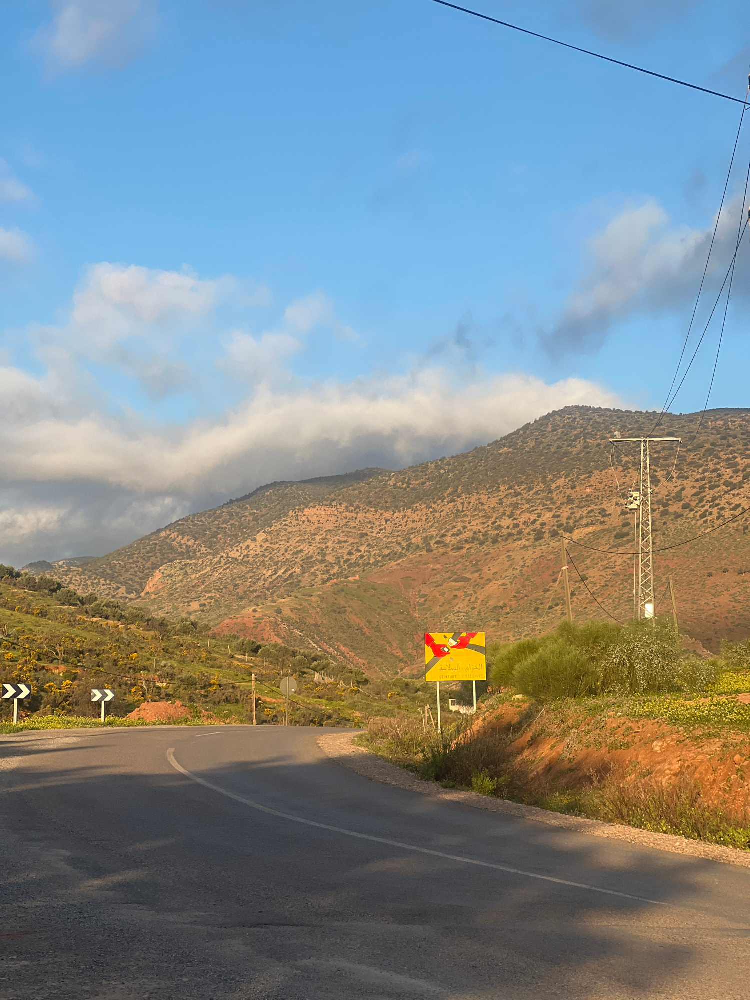 The image shows a road winding along a mountainside in Ouaouizert, Morocco. The road is paved and has a solid white line along the edge. A yellow road sign with red markings is visible next to the roaβ¦read more