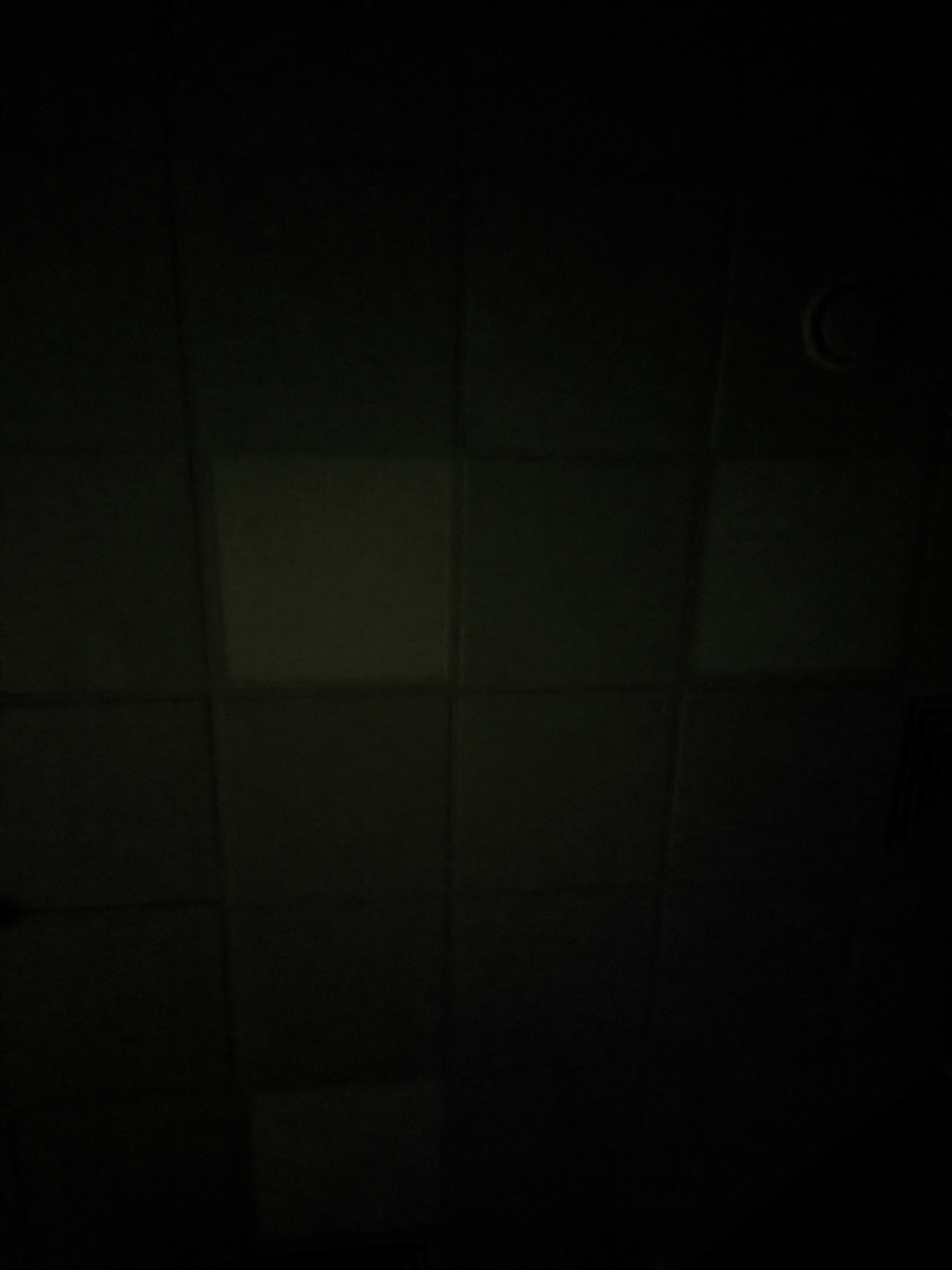 The image shows a dimly lit tiled wall. The tiles are rectangular and appear to be a light color, perhaps white or off-white, though the darkness makes it difficult to determine their exact shade. A s…read more