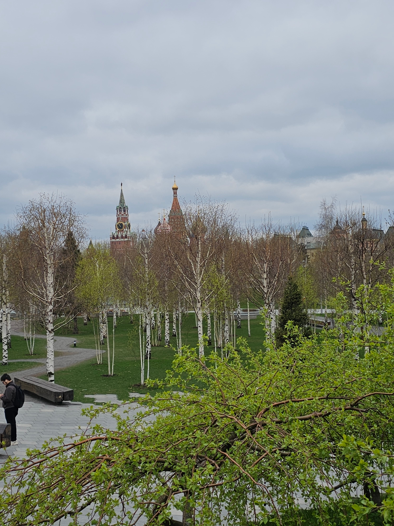 The image depicts a view of Moscow, Russia, featuring the Kremlin and surrounding parkland. The Kremlin, a fortified complex, is visible with its distinctive towers, including one with a prominent clo…read more