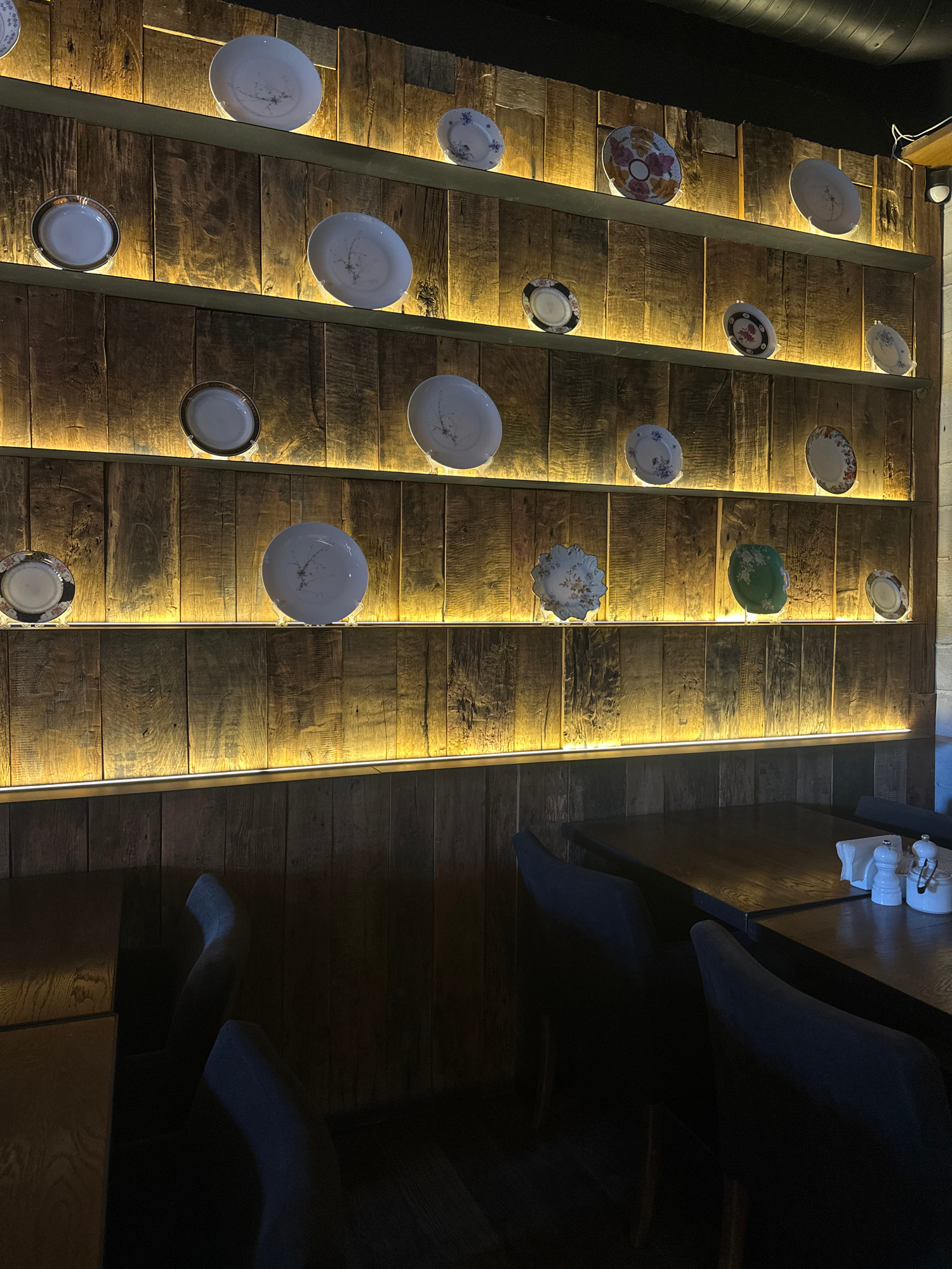 The image depicts a decorated wall and adjacent seating area, possibly inside a restaurant. The wall is constructed of horizontal wooden planks, illuminated by vertical light strips. Decorative plates…read more