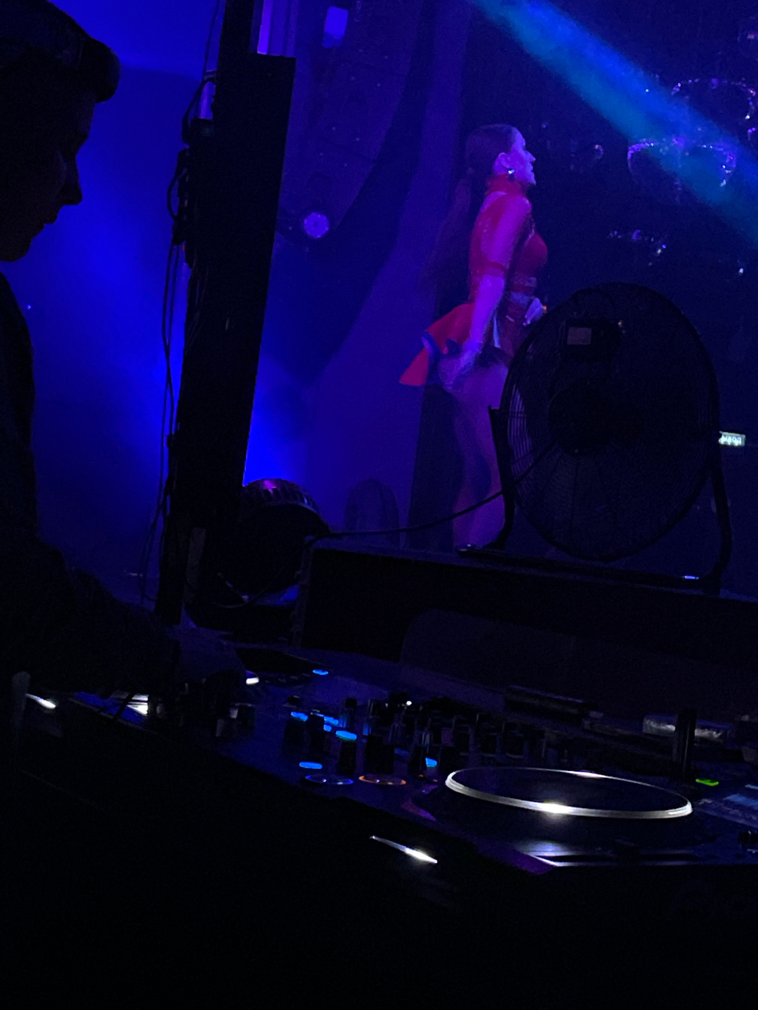 An indoor scene depicts a live entertainment event. In the left foreground, a silhouetted individual, identified as a disc jockey (DJ), is observed in profile, wearing headphones and operating illuminβ¦read more
