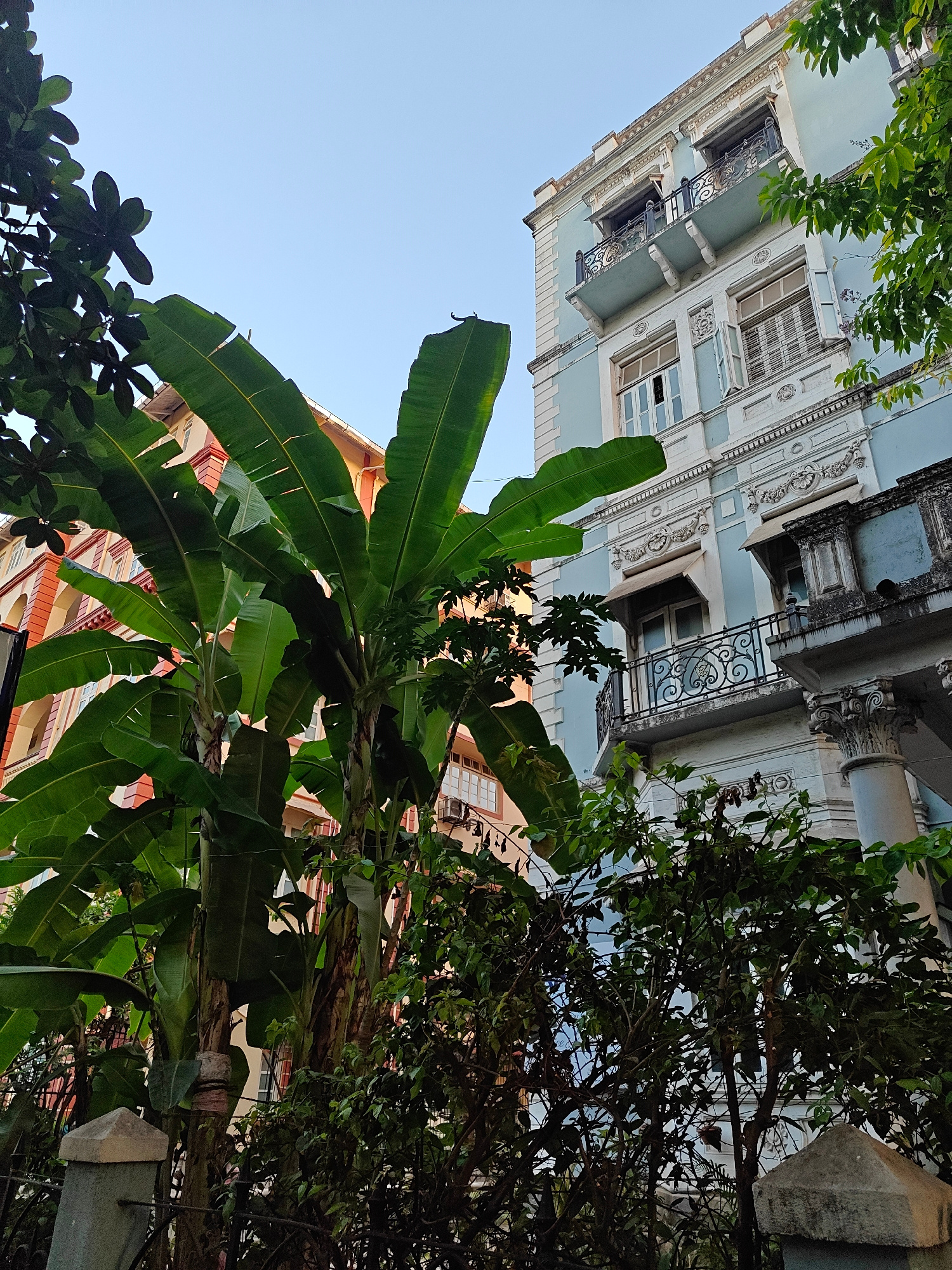 This image depicts a street scene in Mumbai, India, featuring architectural elements and lush vegetation. Two distinct buildings are visible: a light blue building with ornate white trim and wrought-…read more
