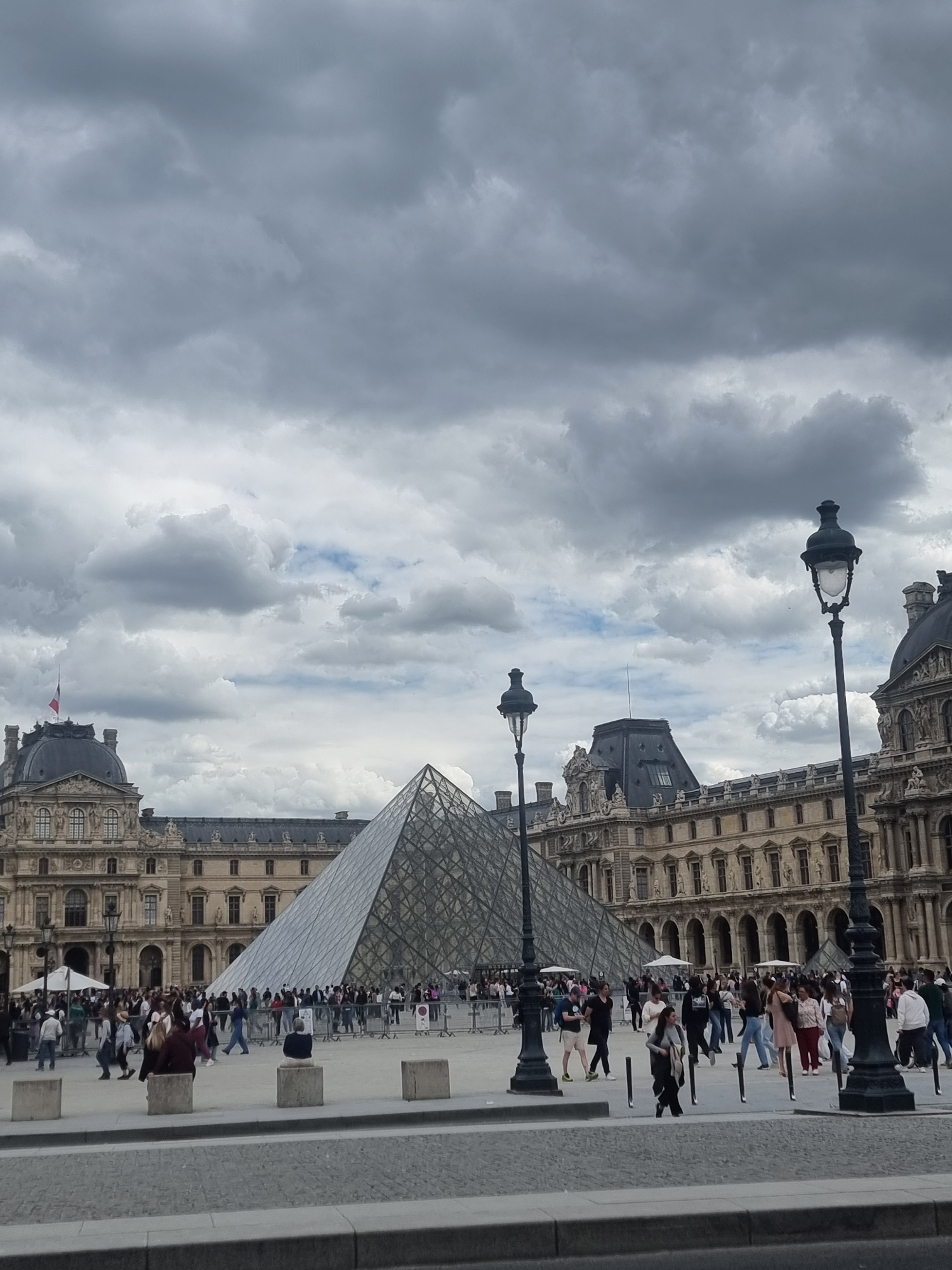 The image captures a bustling daytime scene at the Louvre Museum in Paris, France. The iconic glass Louvre Pyramid stands prominently towards the right, reflecting the cloudy sky. Surrounding the pyra…read more