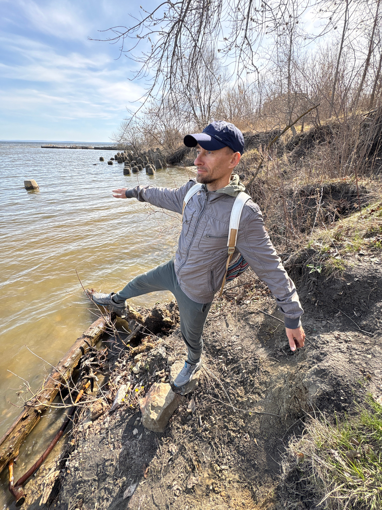 A man is depicted in an outdoor, natural setting, balancing at the edge of a muddy riverbank. He stands with his left foot on a large, partially submerged log or wooden structure in the water, and his…read more