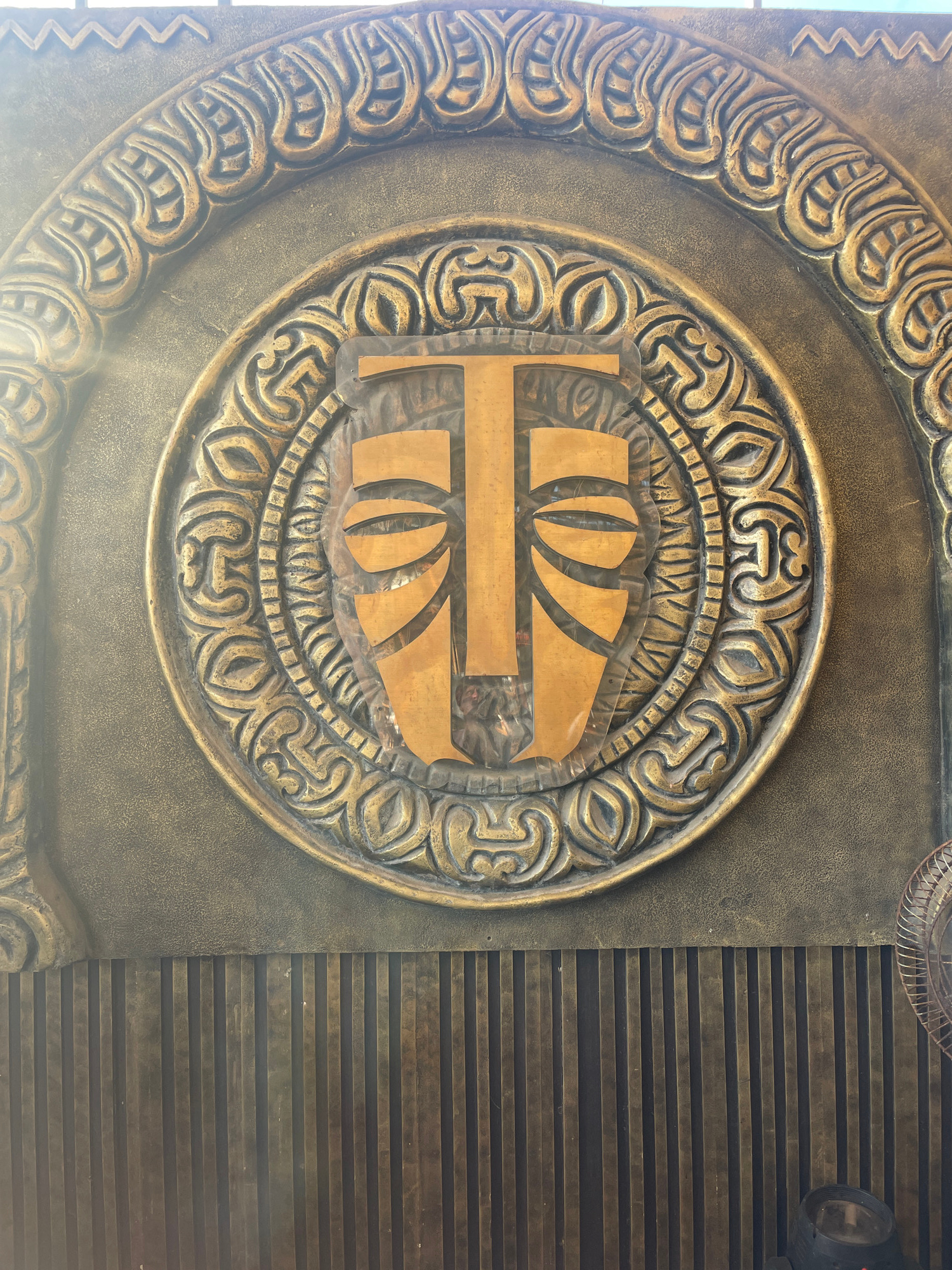 A medium, close-up shot reveals a circular emblem featuring intricate, curvilinear carvings in gold and bronze tones. The emblem is centered within a larger, possibly architectural panel, also finishe…read more