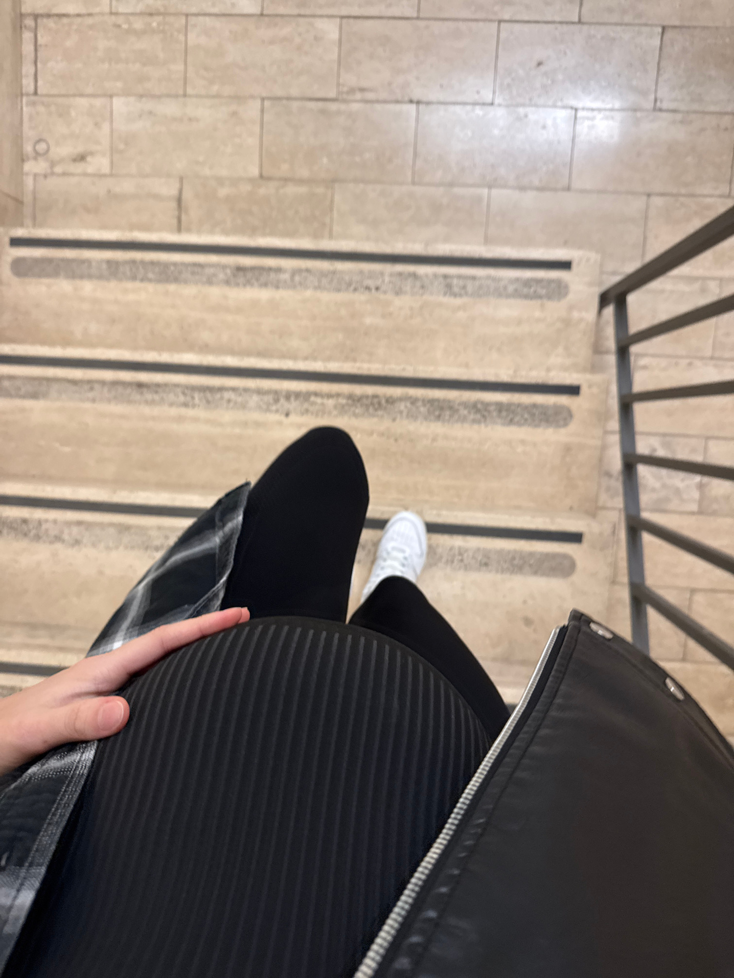 The image, shot from above, depicts a person standing on a staircase. The person is wearing black leggings, a white shoe, and a black leather jacket. A black and white patterned shirt is tied around t…read more