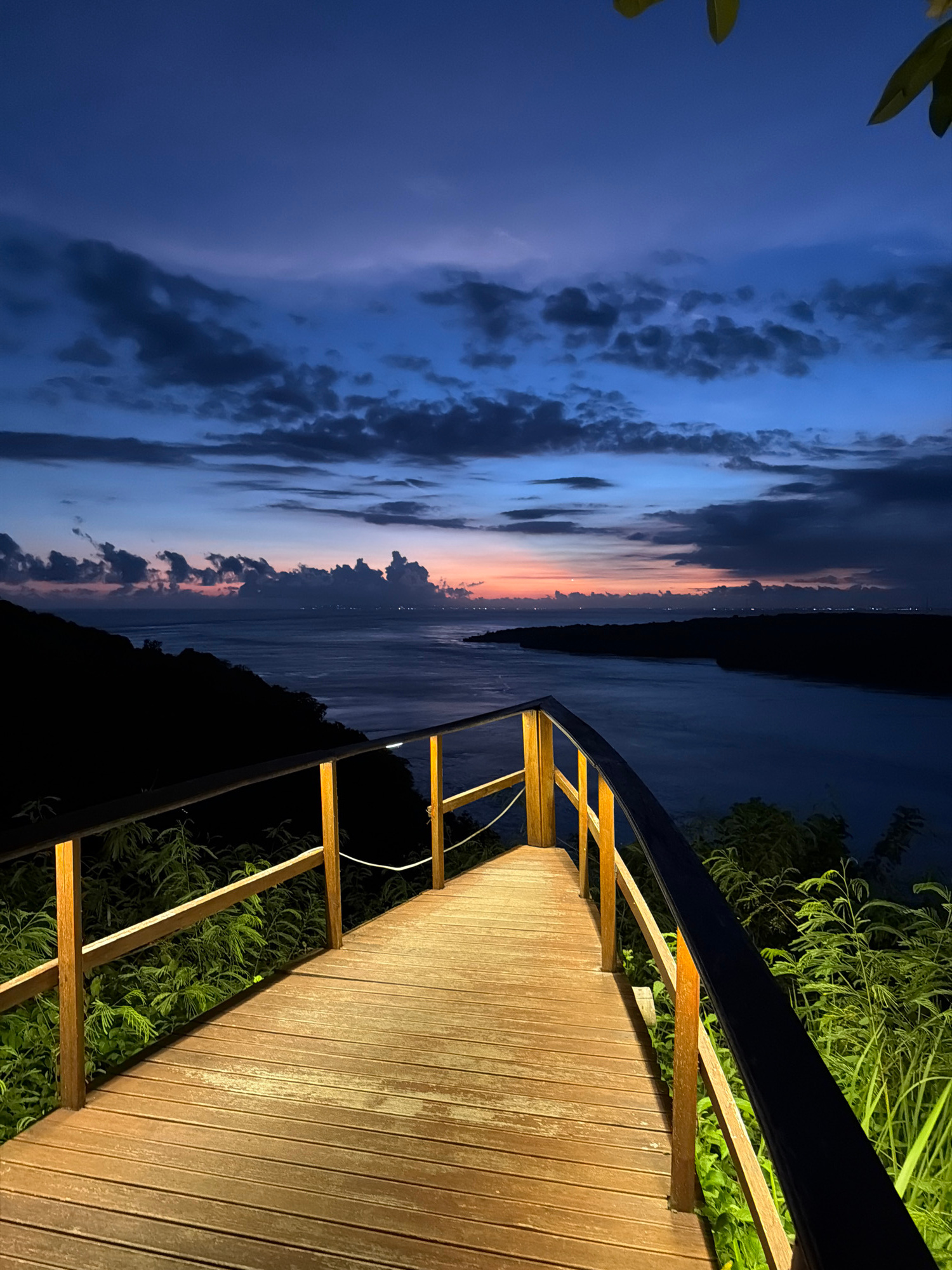 The image depicts a boardwalk with a railing leading towards a view of a body of water and a colorful twilight sky. The boardwalk is made of wooden planks and is illuminated by warm lighting. Vegetati…read more