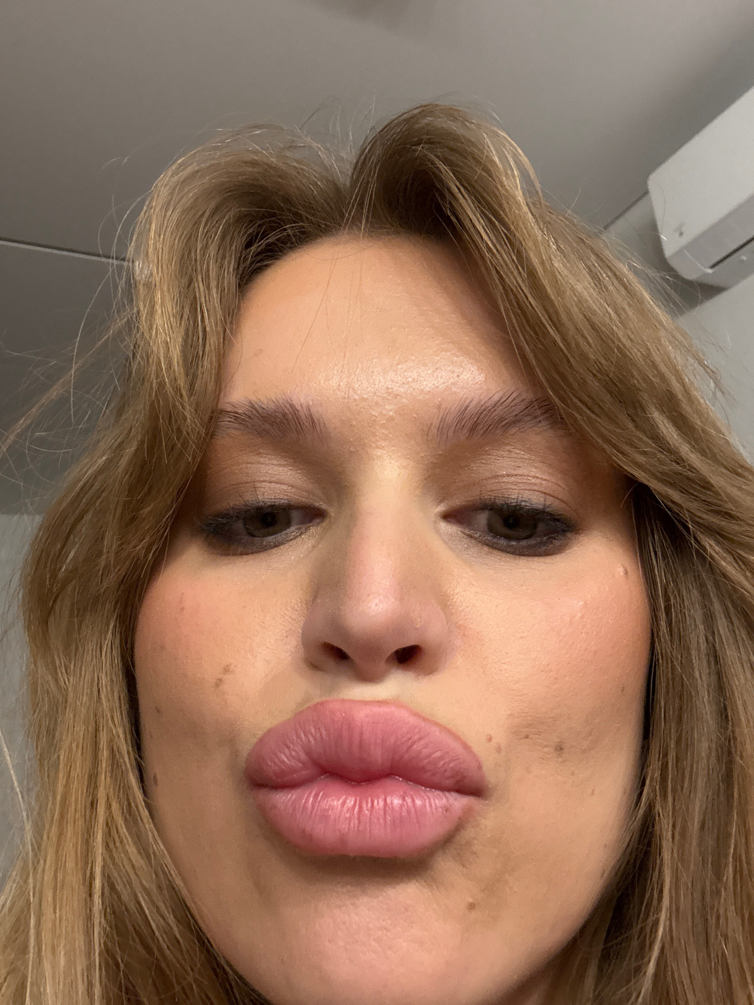 A close-up, slightly angled headshot of a woman with light brown hair. She has fair skin, dark eyes, and full lips. The background appears to be a plain wall with a white fixture visible at the top le…read more