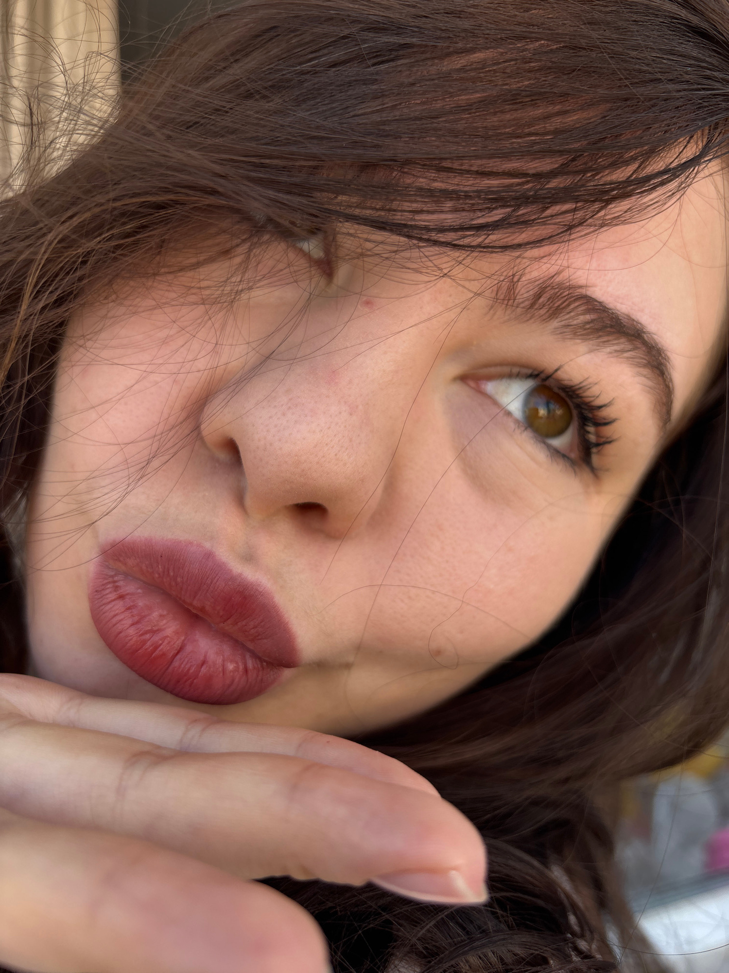 A close-up, angled portrait of an adult female is presented, reportedly from Perm, Russia. The subject's head is tilted right, with long, dark brown hair partially obscuring the upper left portion of…read more