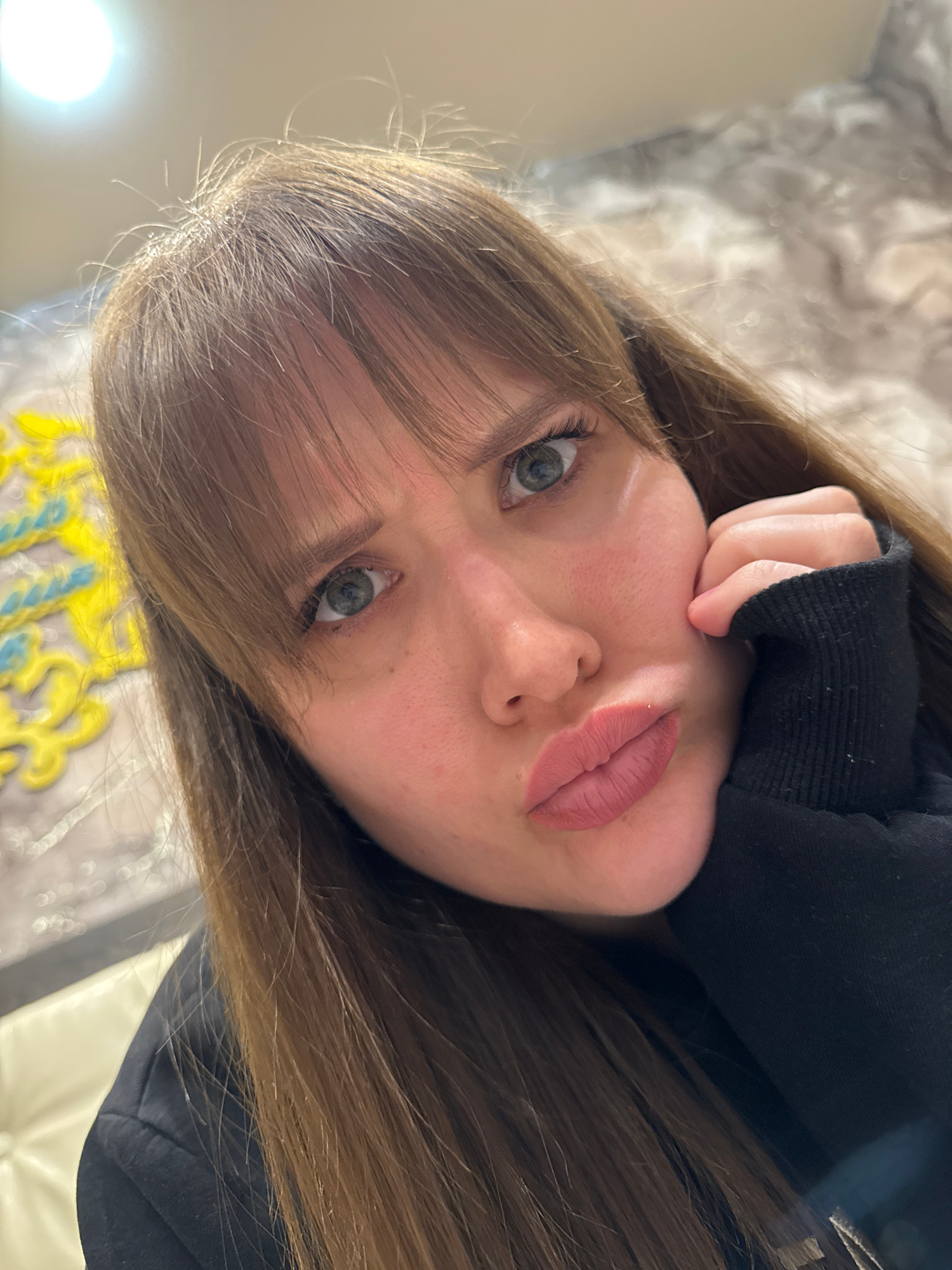 A close-up, angled portrait features a young woman with long, straight, medium-brown hair with lighter strands, partially covering her forehead with bangs. She has striking blue-green eyes that look d…read more