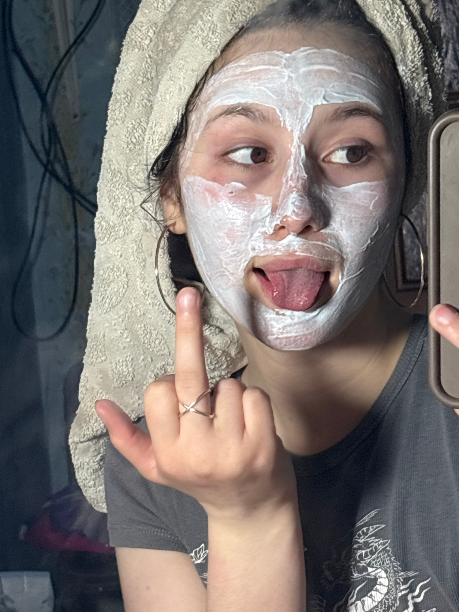 A young person with a white face mask and tongue extended is positioned on a light-colored towel. They are wearing a gray t-shirt with a dragon graphic. Their hand, adorned with a cross ring, is visib…read more