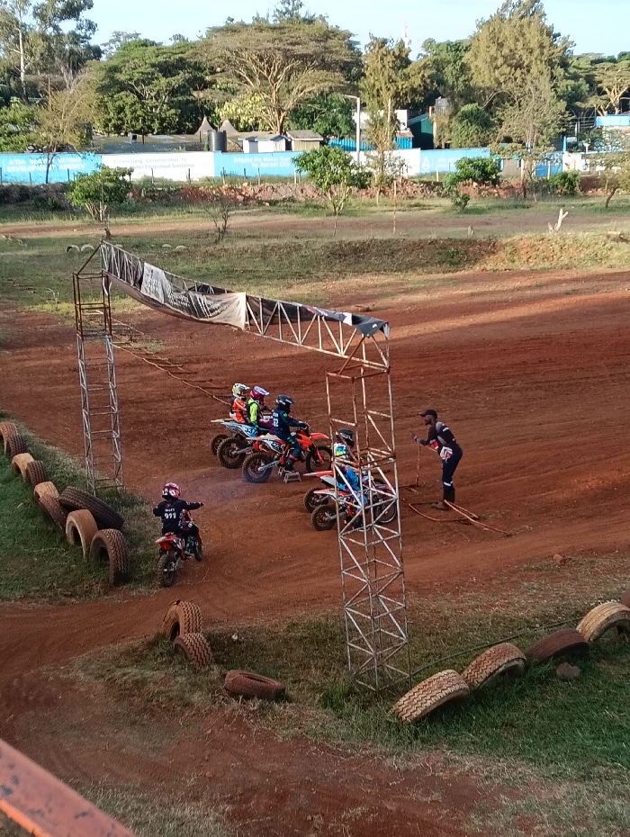 A dirt track with several young motocross riders lined up for a race start. A race official holds a starting gate. Tires line the edges of the track. One lone rider pulls onto the track from a small h…read more