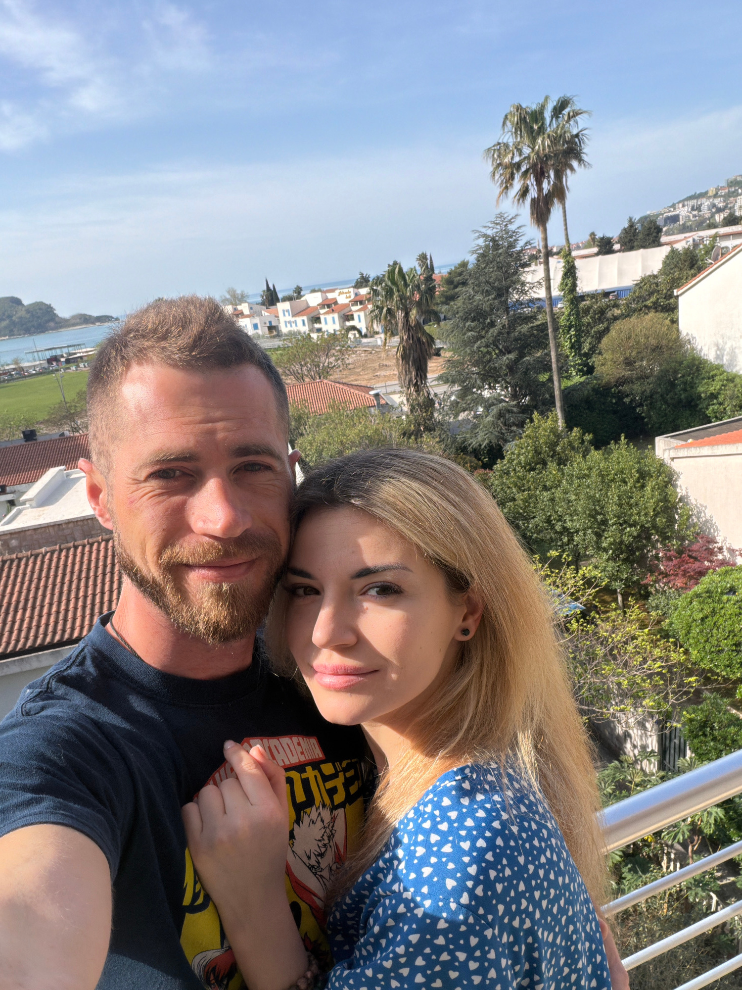 A waist-up shot shows a fair-skinned man and woman. The man has a buzz cut, a beard, and is wearing a dark blue t-shirt. The woman is blond and is wearing a blue dress with small white hearts printed…read more