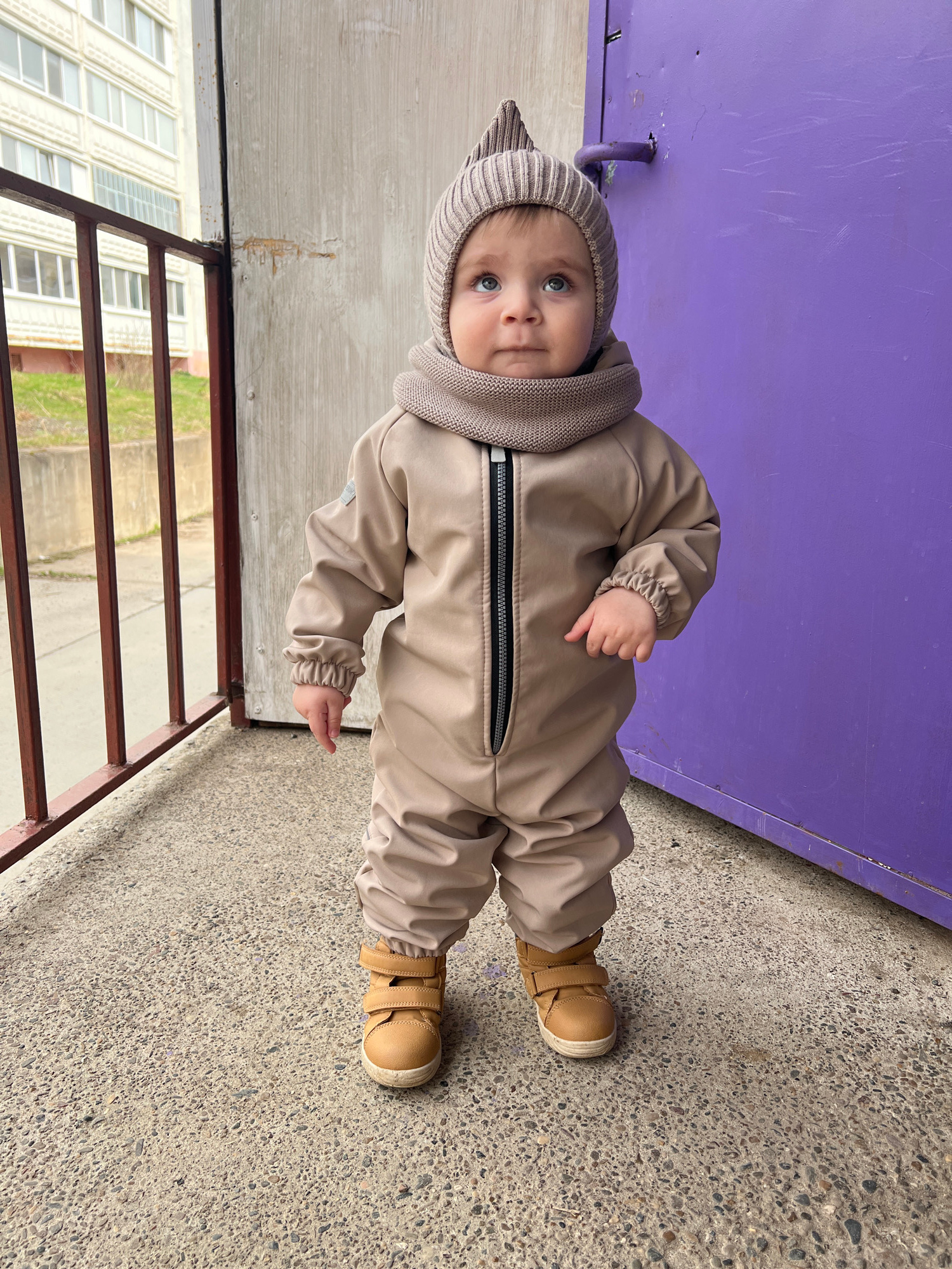 A baby is standing outdoors in Noviy, Russia. The baby is wearing a beige jumpsuit, a beige hat with ear flaps, and beige shoes with Velcro straps. The baby is standing on a textured concrete surface…read more