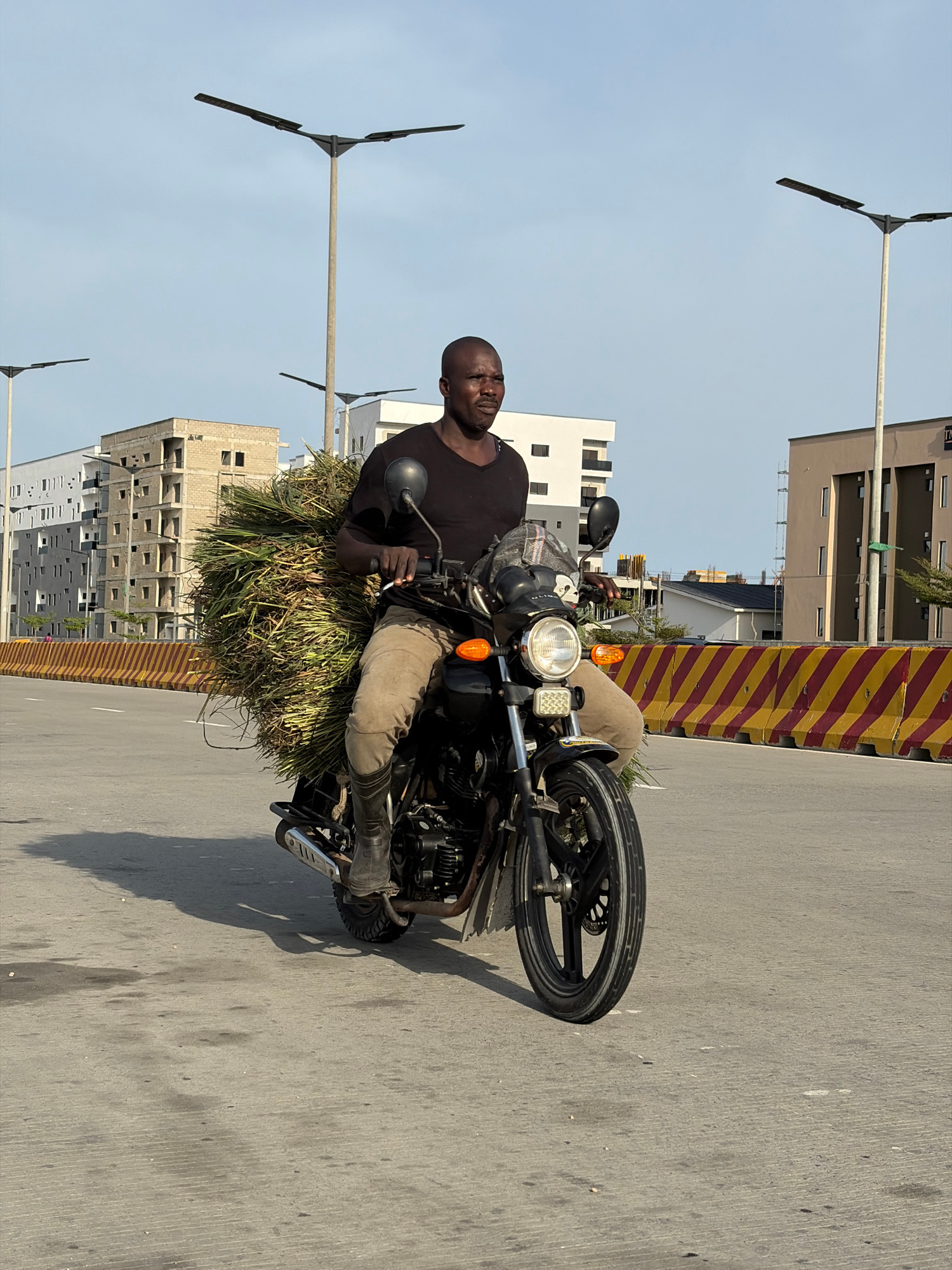 A man is sitting on a motorcycle on a paved road in Alaguntan, Nigeria. He is wearing a black shirt and khaki pants and boots. He has a large bundle of green grass or vegetation tied behind him on the…read more