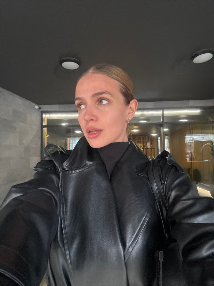 An overhead-angle selfie captures an adult female from the chest up, positioned in an indoor hallway or lobby. She has fair skin, light brown hair pulled back from her face, brown eyes, and her mouth…read more