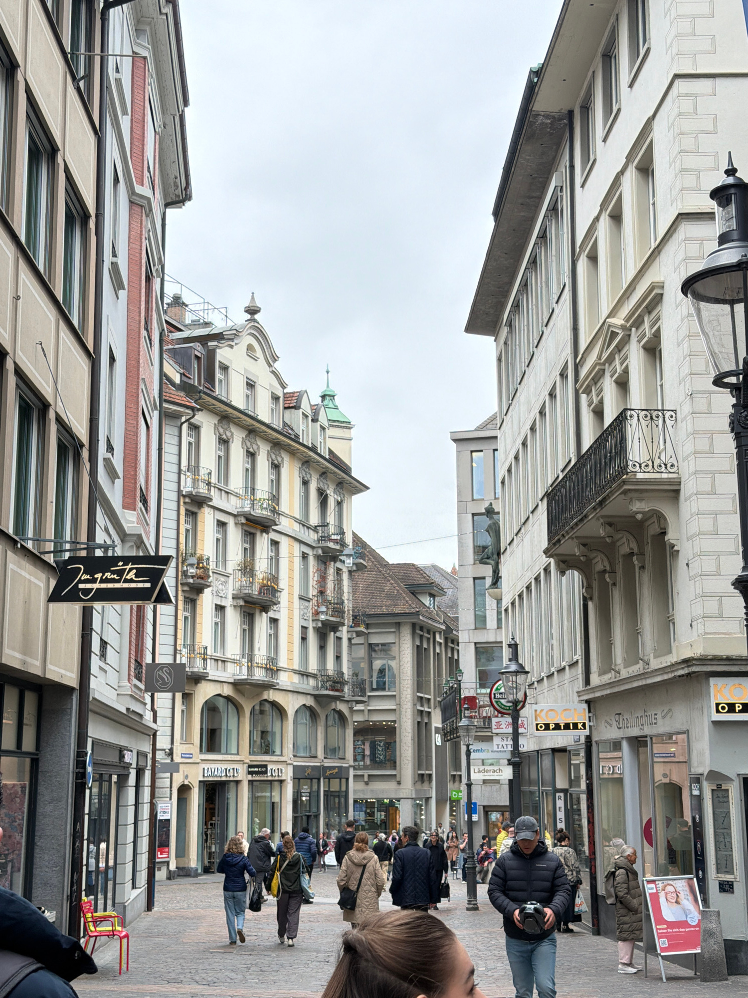 The image shows a street scene in Lucerne, Switzerland. The perspective is from street level, looking down a busy pedestrian street lined with buildings of varying heights and architectural styles. Th…read more