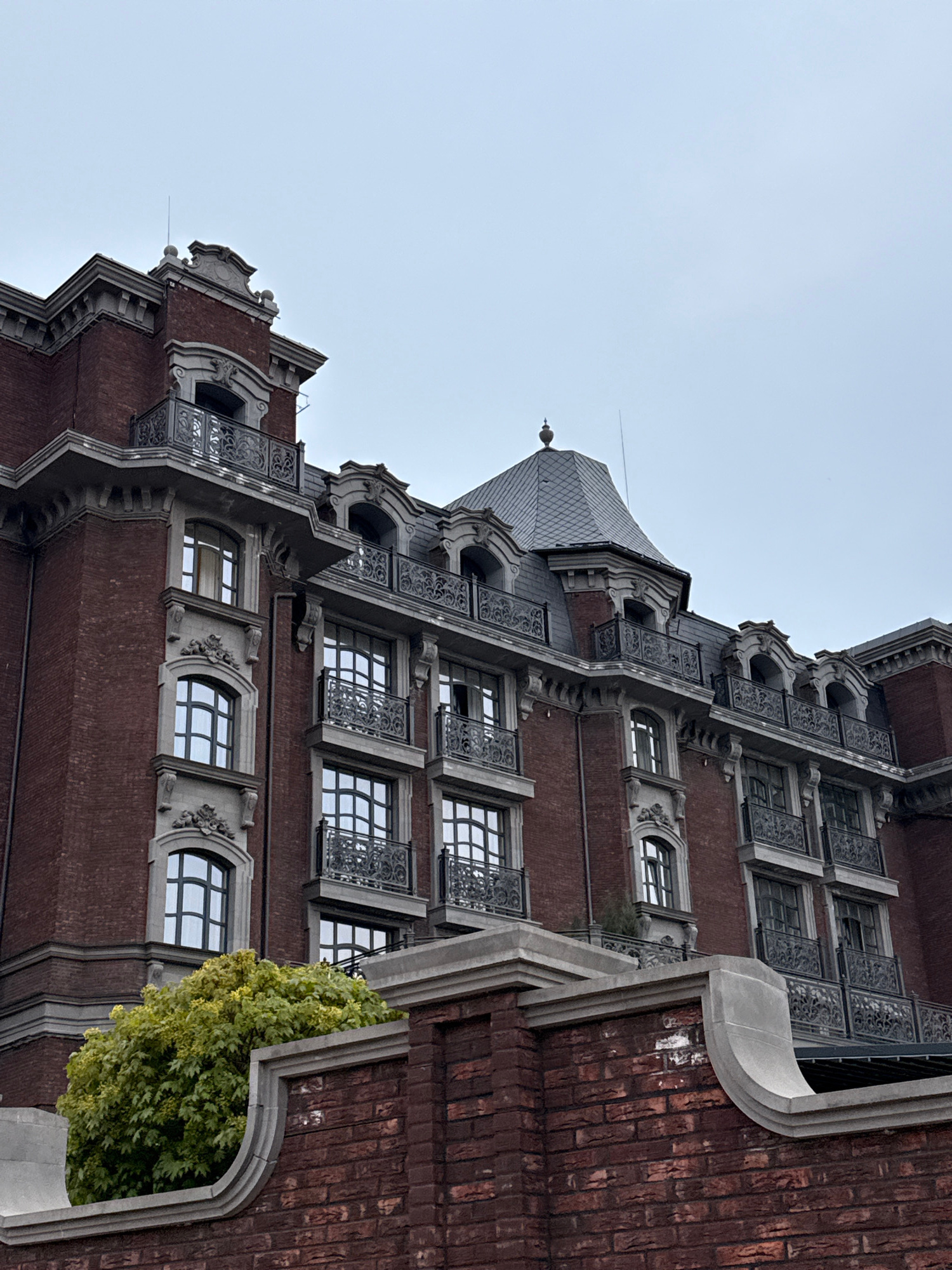 The image shows a partial view of a brick building with ornate stone or concrete detailing. The style is reminiscent of late 19th or early 20th-century architecture. There are multiple rows of windows…read more